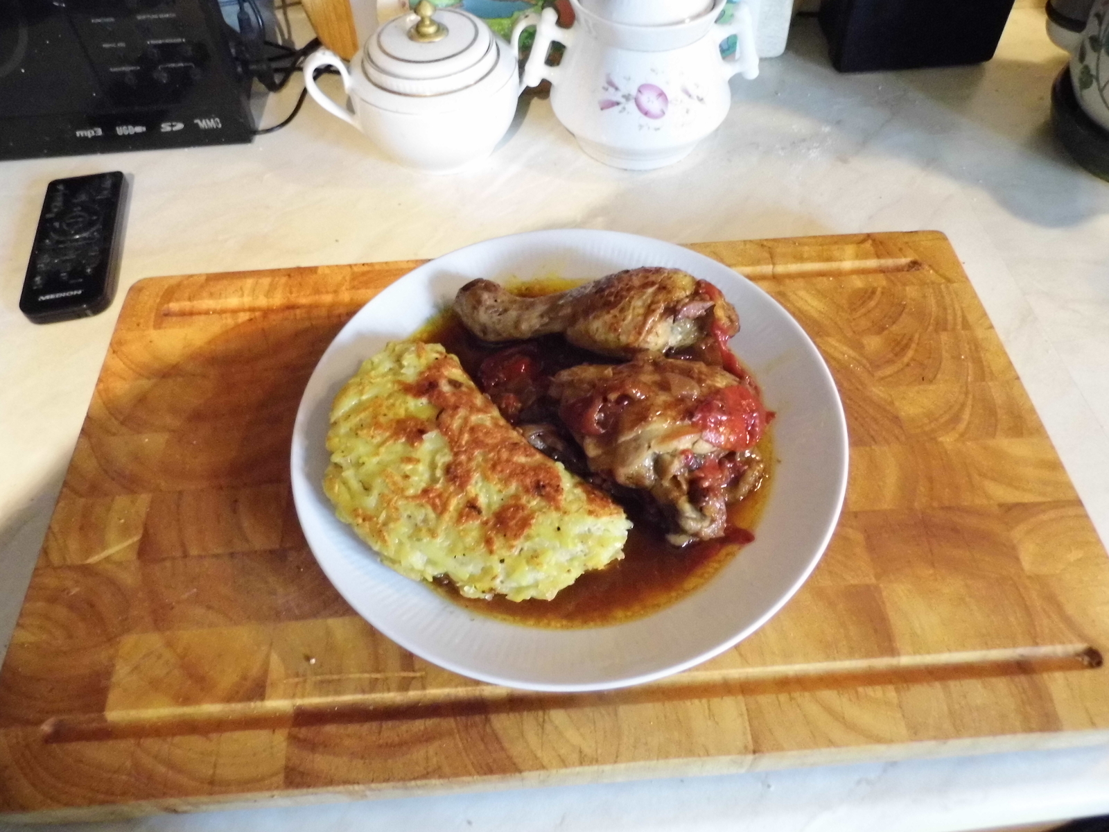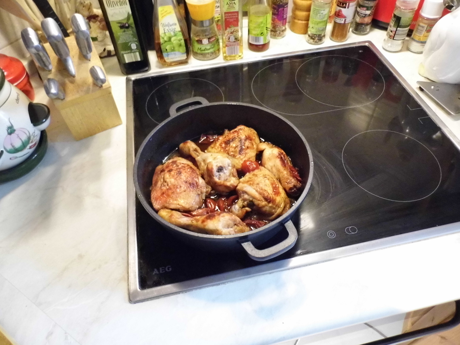 Heute gibt es(gabs gestern auch schon) Hähnchenkeulen gesalzen und mit Rosenpaprika bestreut mit Teryakimarinade mariniert, angebraten, Zwiebel, Knoblauch und geviertelte Tomaten in dem Sud glasig gebraten, mit Gemüsebrühe und einen Schluck Rotwein abgelöscht, die Keulen wieder hinein und das Ganze für 40 Minuten bei 150° Umluft in den Ofen. Einfach lecker.