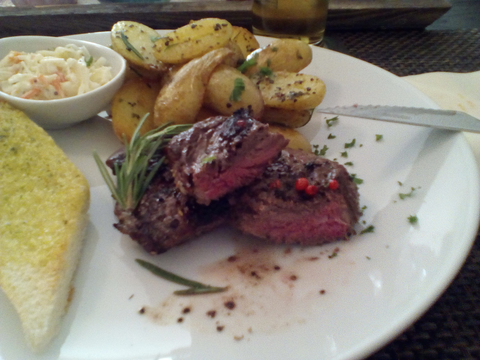 Hauptgang Hüftsteak, nur ein Kleines (180g), da ich ohnehin schon halb gefüllt war. Statt der Folienkartoffel wurden mir unaufgefordert Rosmarinkartoffeln angeboten, was ich auch gerne annahm.