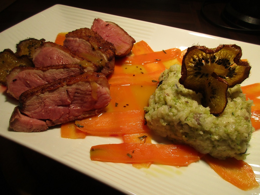 es gab entenbrüstchen mit broccolierisotto, feine möhrchenstreifen dazu ein orangen-kiwi-sößchen.....