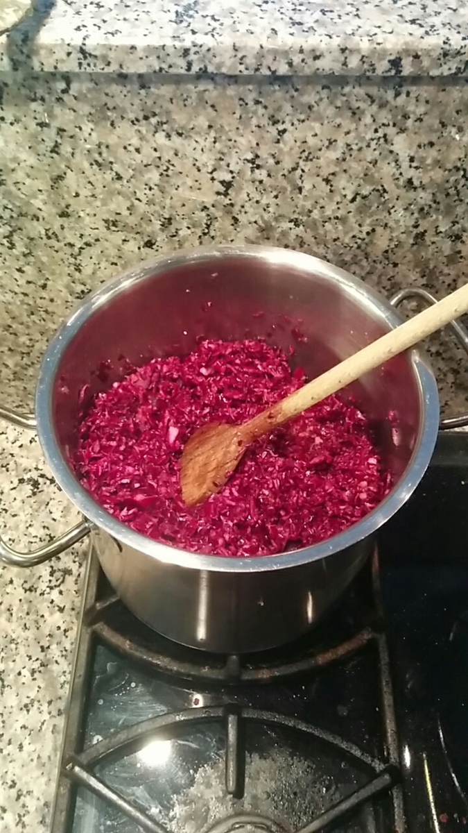 Der Rotkohl ist vorbereitet uns muss jetzt noch eine Stunde köcheln! Mit dem TM5 hat meine beste aller Ehefrauen 1000 gr Rotkohl gehäckselt, dazu Schmalz, Essig, Salz, Zucker, Wacholderbeeren, Äpfel, Lorbeerblätter, Brühe, Zwiebeln, Traubensaft und nachher noch Preiselbeeren dazu gegeben. Ich kann jetzt schon verraten, er schmeckt nicht wie aus dem Glas, sondern viel besser ...