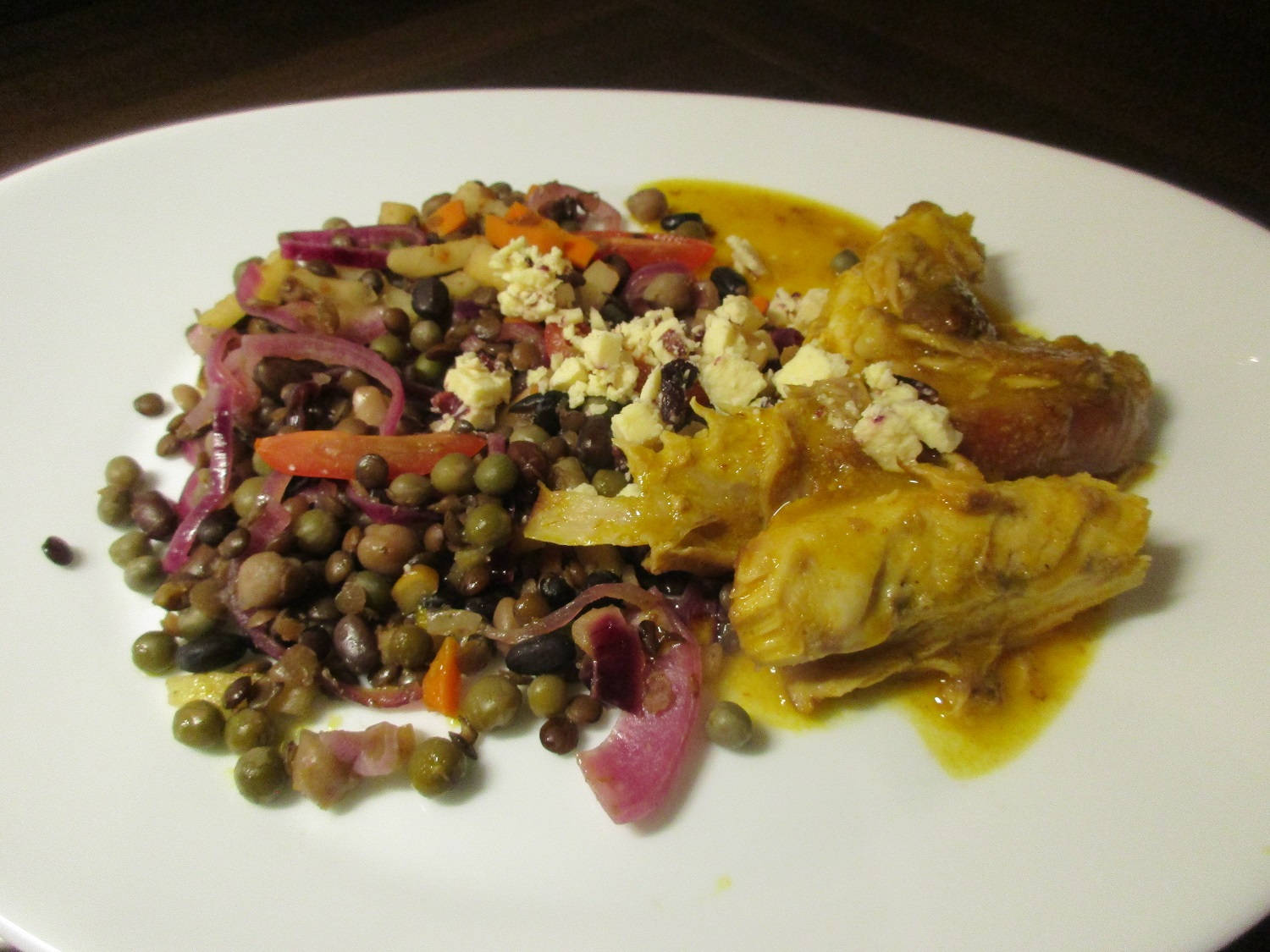 heute gab es bei uns kaninchen mit einem lauwarmen süß-sauren hülsenfrüchtemix