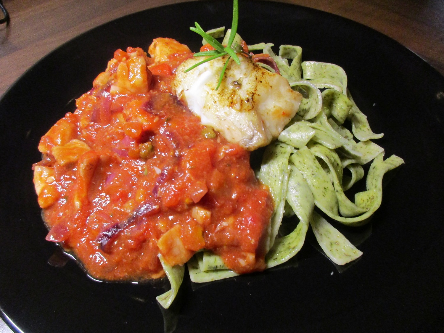 heute bei uns seehechtgulasch in selbstgebastelter tomatensoße an kräuternudeln