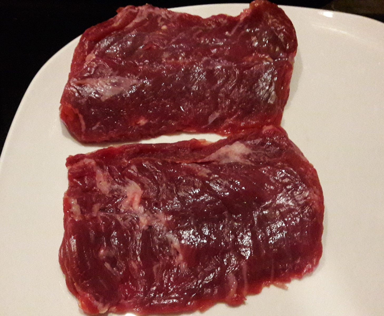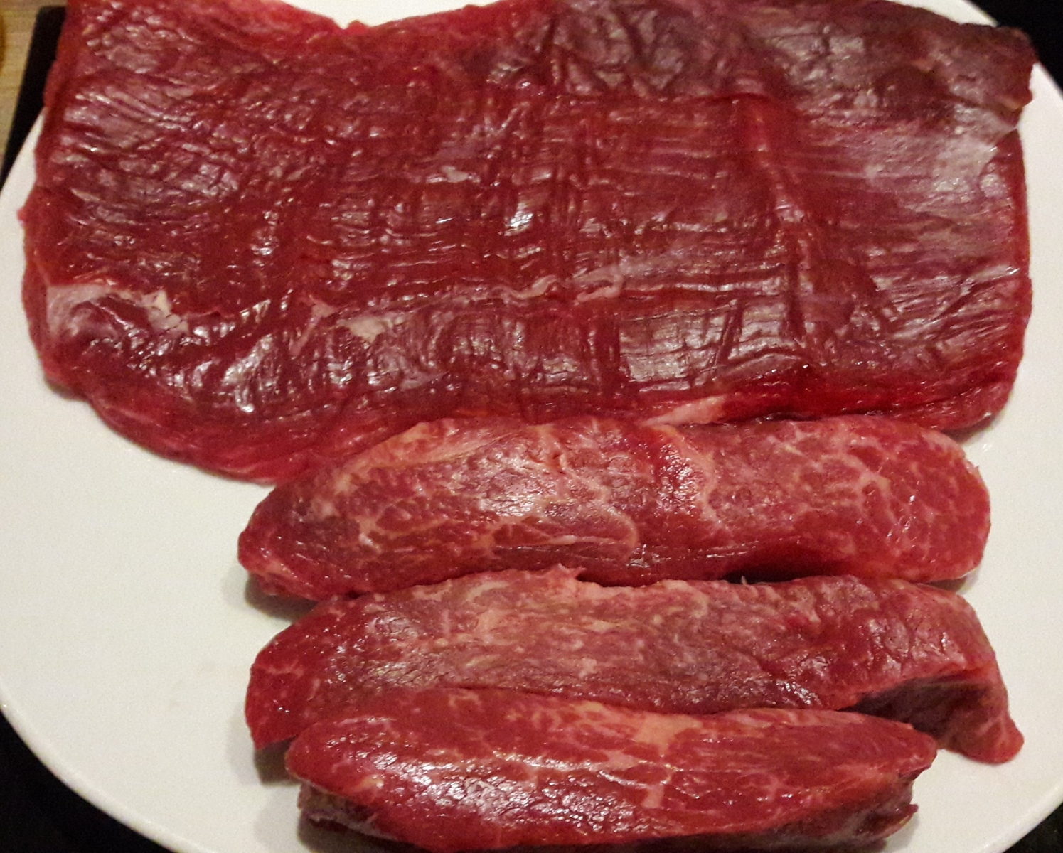 Oben seht ihr ein Flanksteak, darunter 3 geschnittene Tri Tip Steaks.