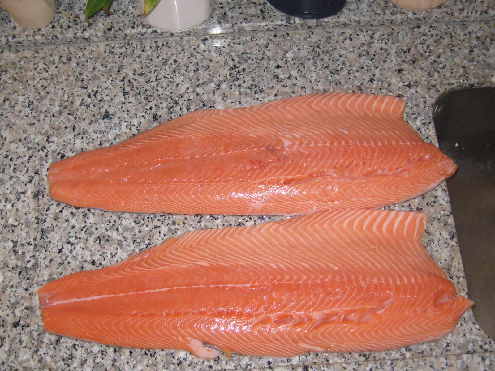 Zwei Lachsseiten deshalb, weil meine Familie bedient werden will und meine Dienststelle sofort hier gerufen hat. Also auch für mich eine Premiere in der Zubereitung einer recht großen Menge