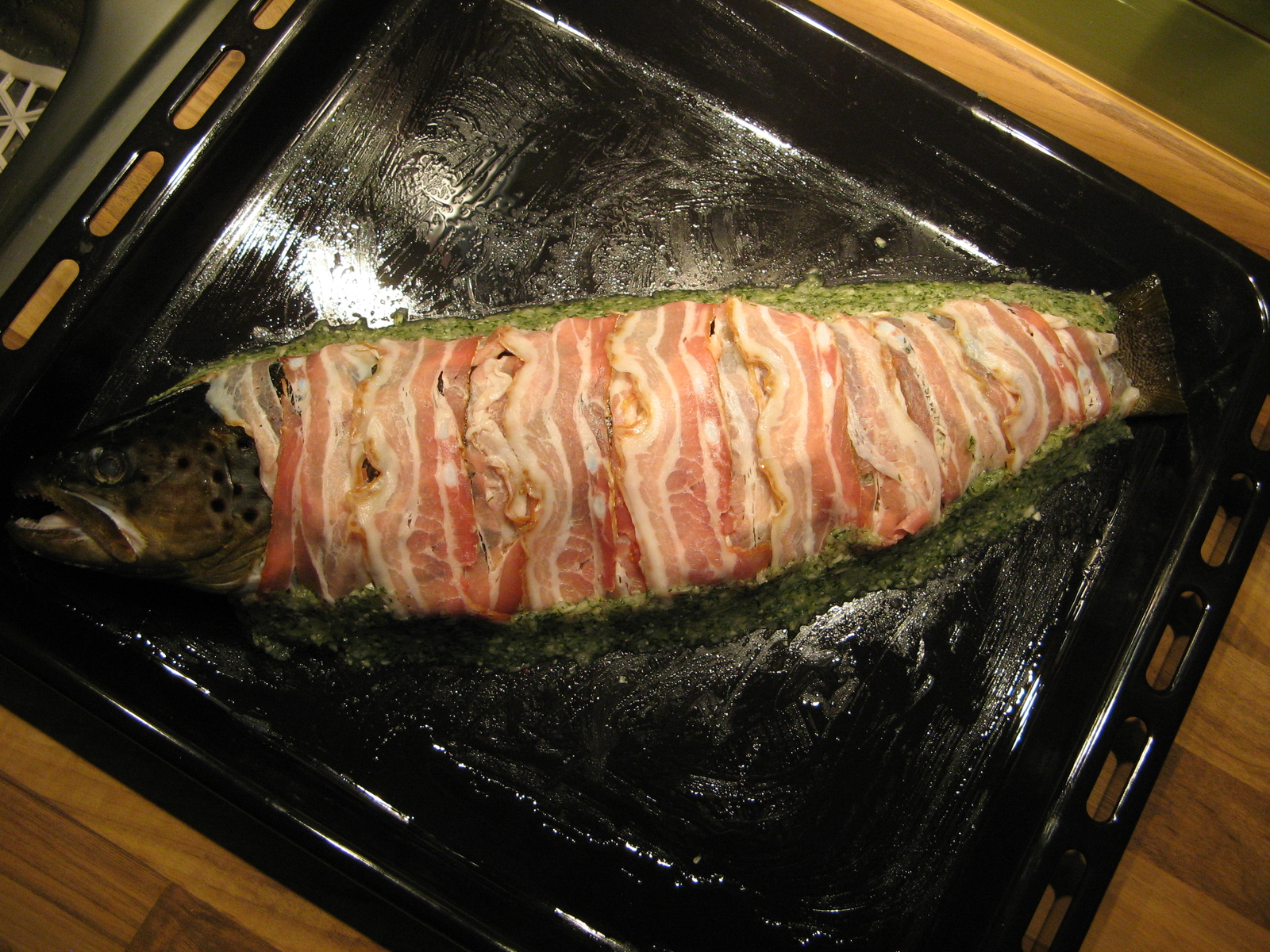 Fisch von innen und außen salzen und pfeffern. Zwiebeln, Knobi und Dill klein hacken und vermischen. Mit einem Teil davon den Fisch füllen und mit Spießen verschließen. Den Fisch mit Speckscheiben vollständig einwickeln. Den Rest der Mischung um den Fisch verteilen und das Blech mit Wasser auffüllen, bis der Boden bedeckt ist. Bei 200°C ca. 30 Minuten backen. Schmand, saure Sahne und Sahne mit Pfeffer, Salz Paprikapuler, Dill und/oder Petersilie abschmecken und nach der genannten halben Stunde über den Fisch geben und ca. 15 Minuten weiterbacken. Dazu Petersilienkartoffeln und Gurkensalat.