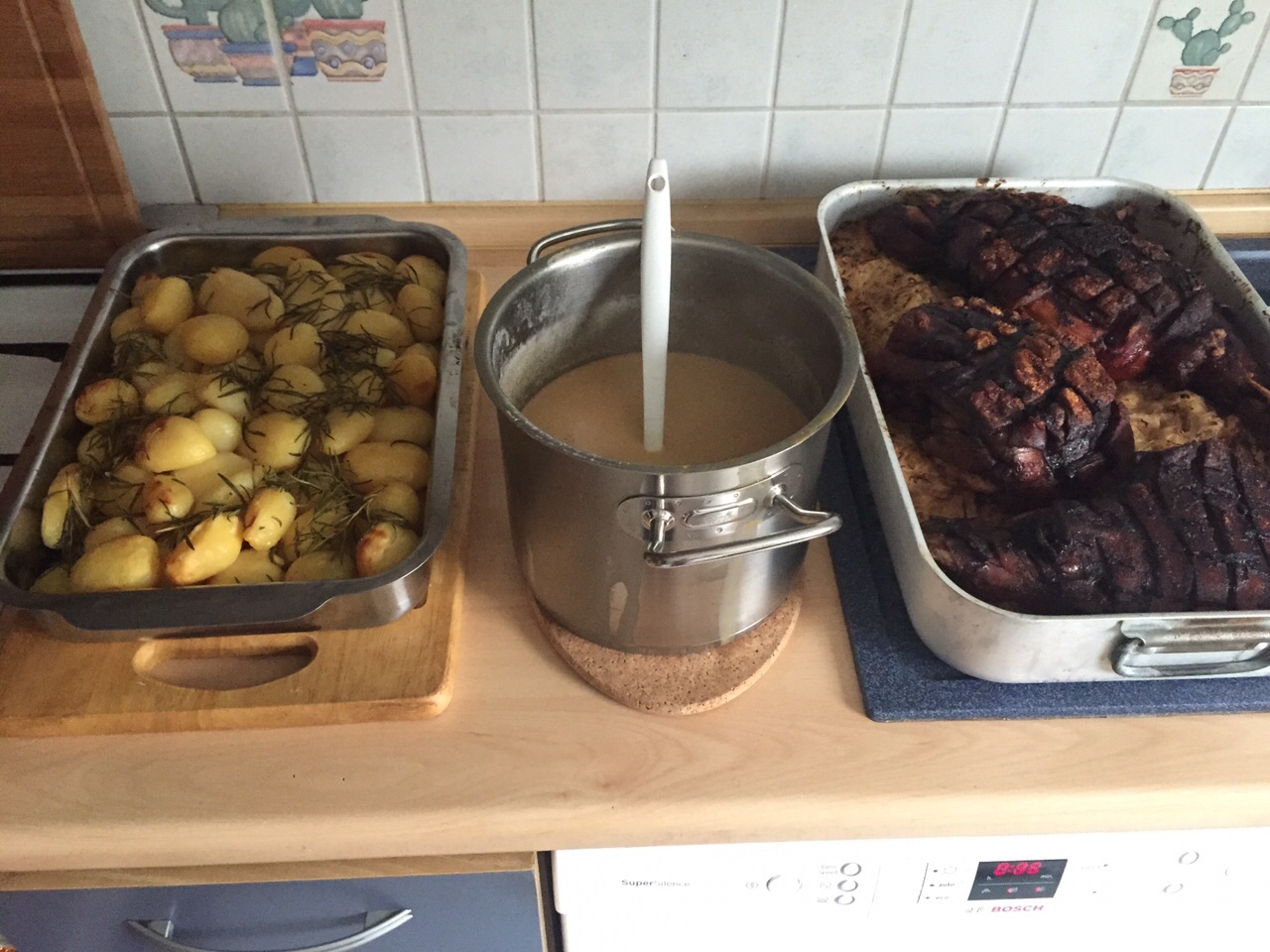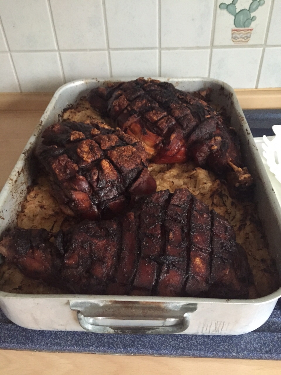 Am Samstag habe ich für einen guten Freund und seinen 17 Gästen Spanferkel mit Sauerkraut und Rosmarinkartoffeln gemacht ... Das Spanferkel war bei 120-130 Grad acht Stunden im Backofen, dann noch mal Turbohitze von oben ... Das Fleisch sieht nur dunkel aus, sie war kross und das Fleisch benötigte kein Messer! Ein Gedicht und super Rückmeldungen ...