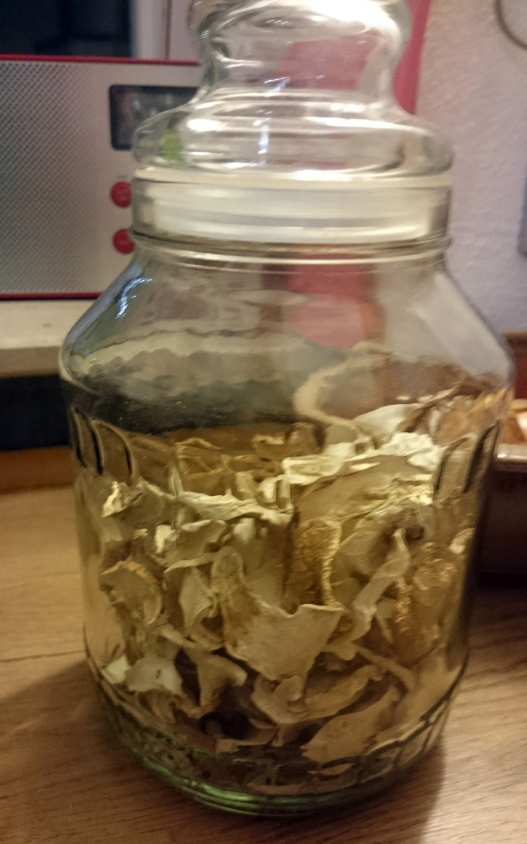 Danach wurde das Fleisch angebraten und unter zugabe von Gewürzen, Büchsentomaten und vielen getrockneten Steinpilzen zu einem Gulasch gekocht. Am Schluss noch ein Becher Schmant dazu.....
