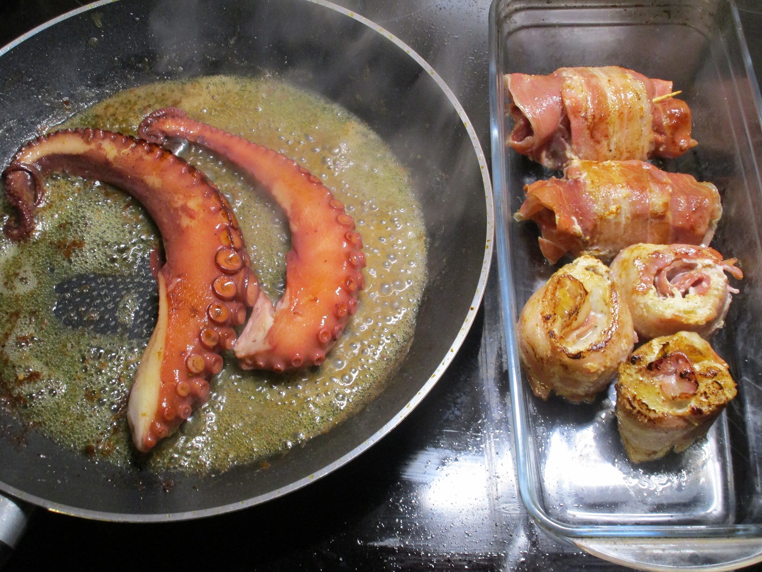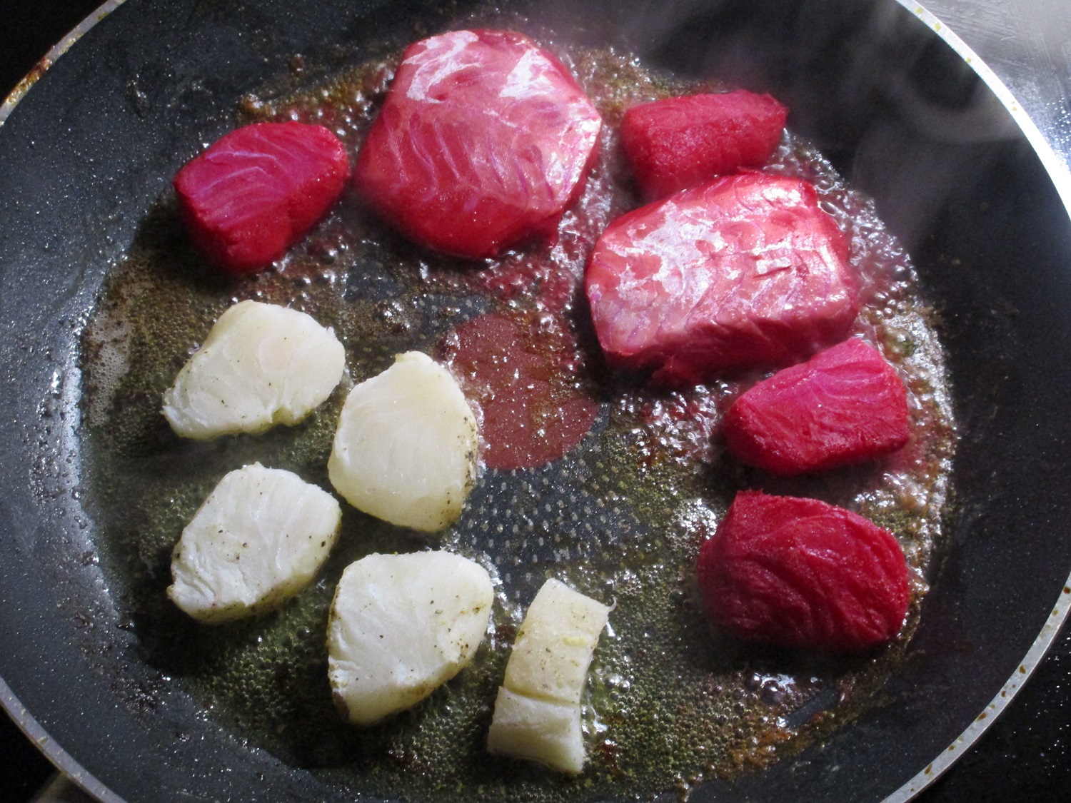 pulpo, roter fisch und miniloins wurden in butter angeschwenkt...