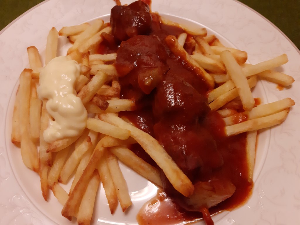 Pommes goldig (hat da noch was zu meckern) und Schaschlik braucht Tage um richtig zu schmecken...ehrlich....