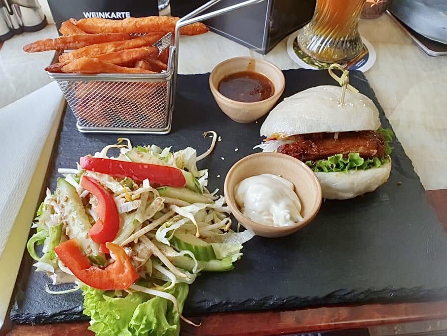 Ich hatte mich für Hefekloßburger mit Entenbrust, Süßkartoffelpommes und Salat entschieden. War garnichtmal so schlecht.