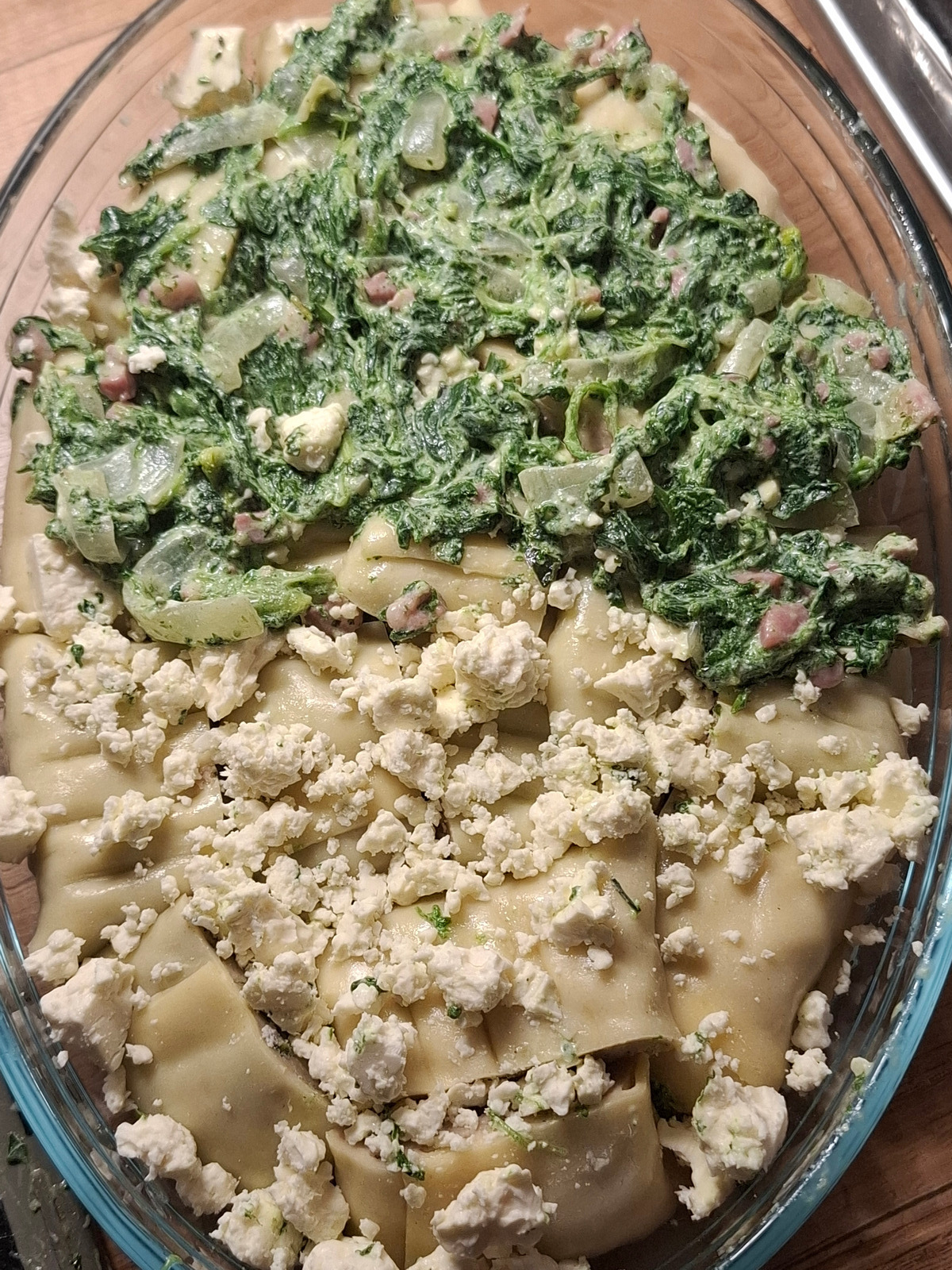 ...alles mit Fetakäse, Spinat, Zwiebel, viel Knoblauch und Sahne geschichtet und als Topper mit Käse bekrümelt und ab in den Ofen ...