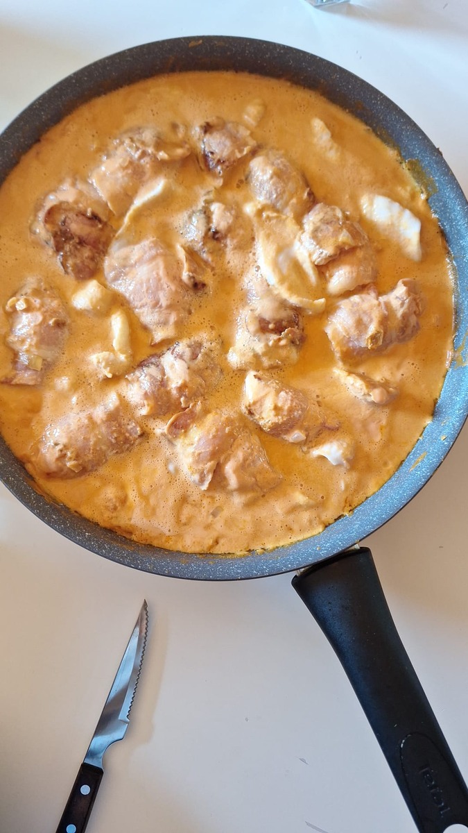 Wenn alles schon angebraten ist , kippt ihr die paste/Sahne Mischung dazu und lasst das ganze etwas köcheln .