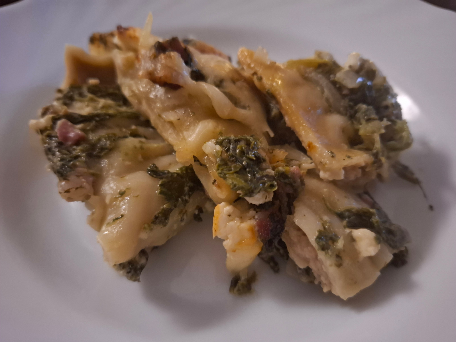 ...alles mit Fetakäse, Spinat, Zwiebel, viel Knoblauch und Sahne geschichtet und als Topper mit Käse bekrümelt und ab in den Ofen ...