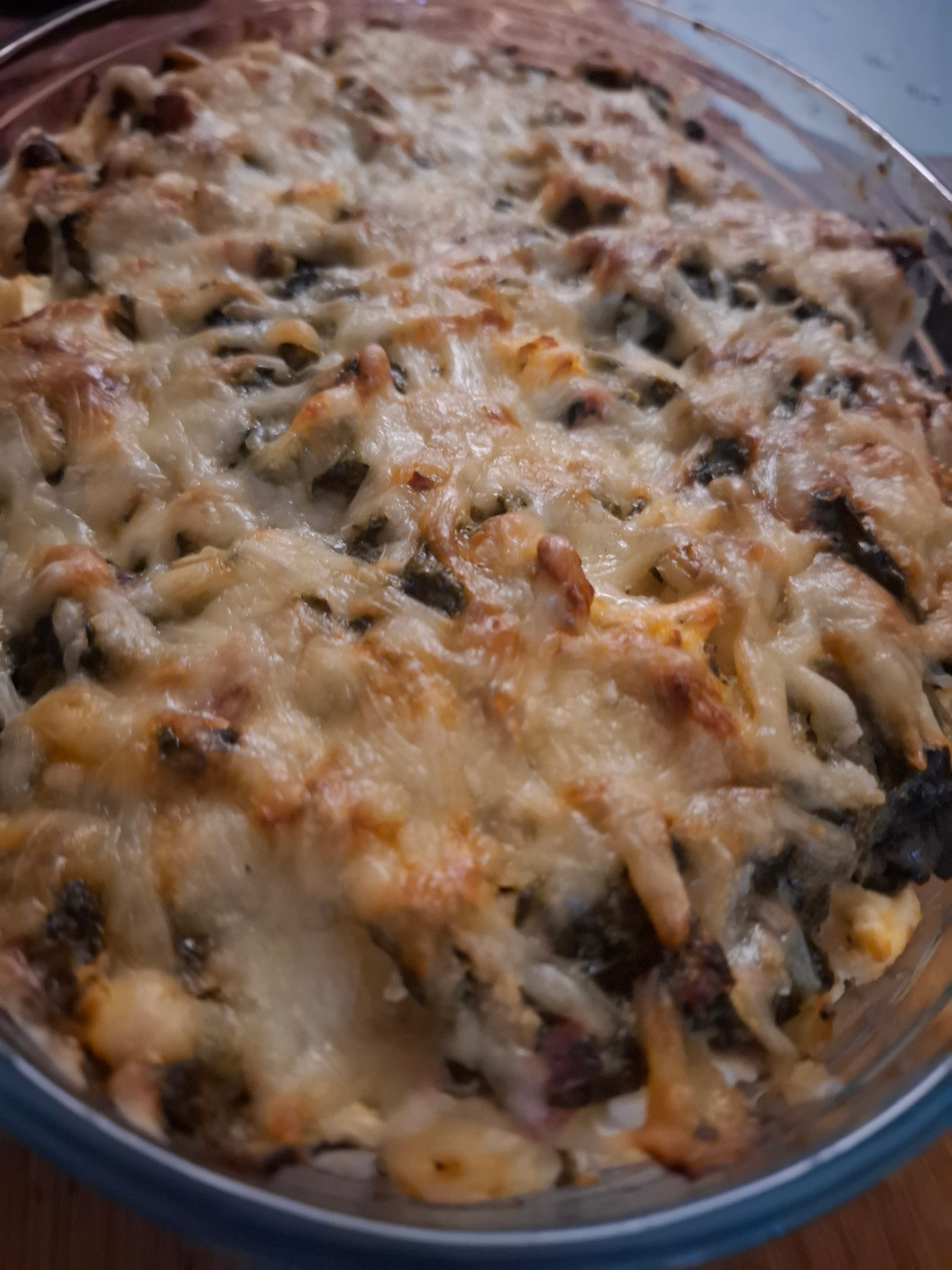 ...alles mit Fetakäse, Spinat, Zwiebel, viel Knoblauch und Sahne geschichtet und als Topper mit Käse bekrümelt und ab in den Ofen ...