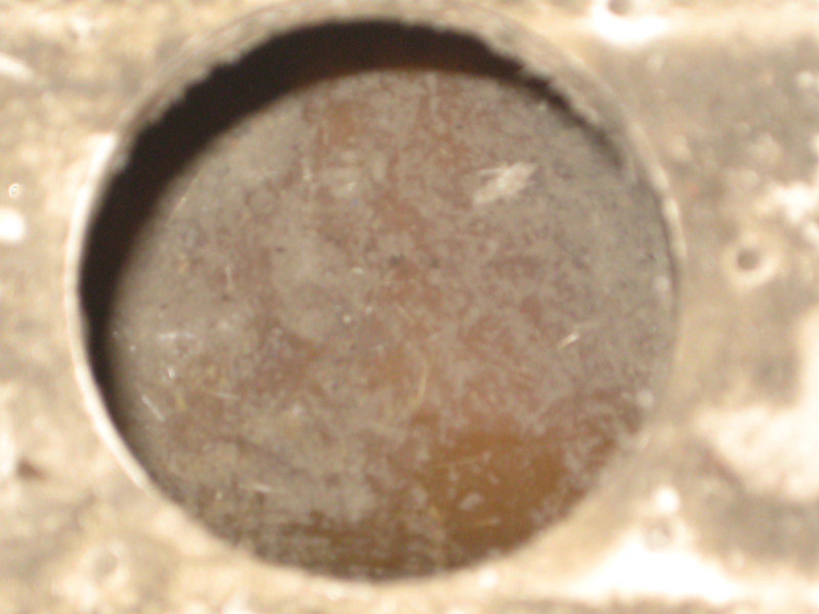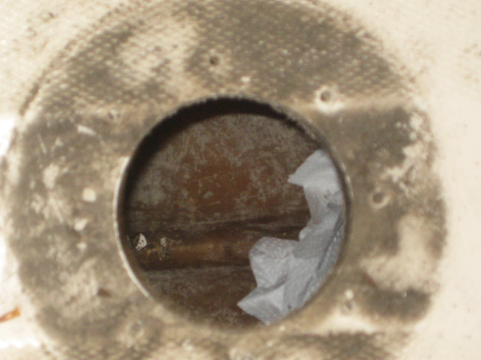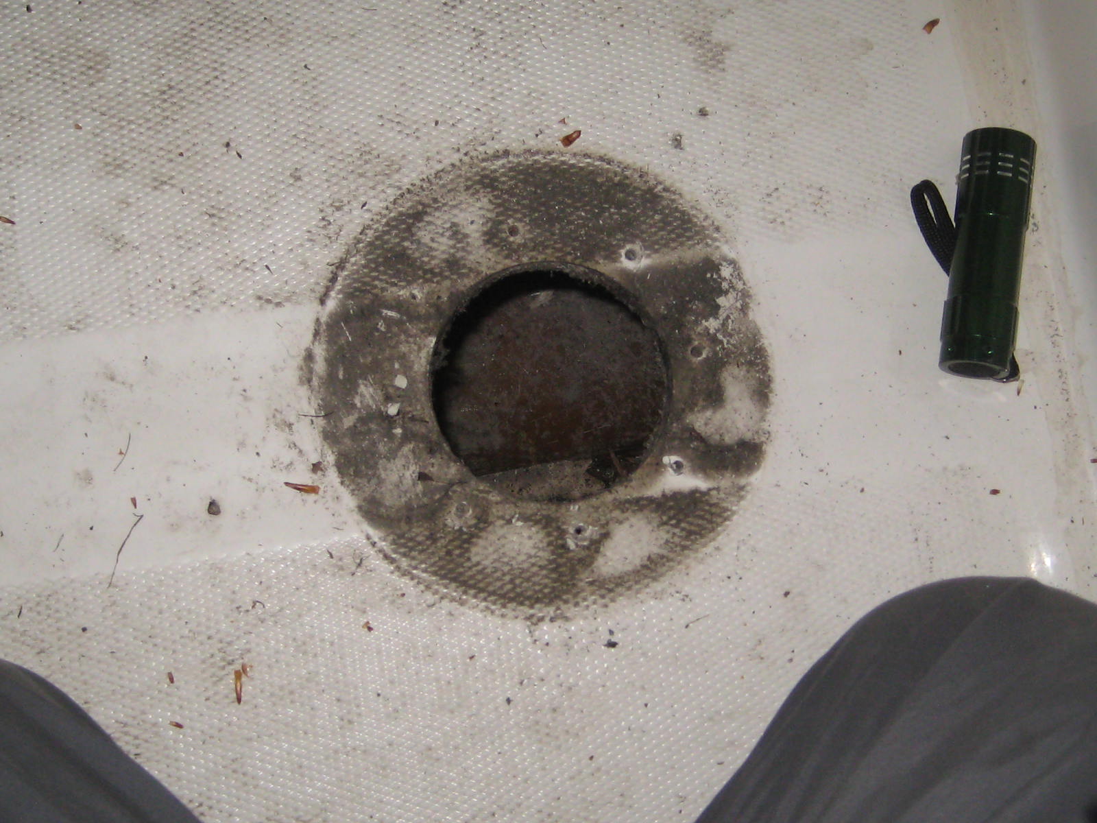Den Fuß habe ich rausgeschraubt und die Bilge war trocken, bis auf einen Rest an GFK, vermutlich durch das Heraussägen des Standfusses im Bodeneinlass. Der Fuß war einfach eingeschraubt, nicht mit Sikaflex eingedichtet.Aber es kommt noch besser! Nachdem ich den Fuß draußen hatte, wollte ich ihn sauber machen und stelle fest, in der Umwandung befindet sich ein Entwässerungsloch. Wenn die Stangenaufnahme nach Regen, Seewasser oder beim Spülen vollläuft, "pullert" ein stetiger ca. 2mm starker Strahl das Wasser in die Bilge, immer weiter, immer stetig. Ganz großes Kino - eine Entwässerung in die Bilge!!! Wer kommt auf so eine Idee.