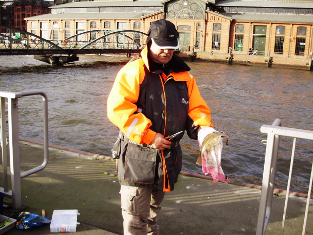 je eine Rute kam gegen die Kaimauer zum Einsatz, und mit je einer Rute versuchten wir unser Glück im Hauptstrom , immer wenn die Fähren ablegten hatten wir cirka 10- 15 min Zeit um das 80gr Blei mit Nachläufermontage Richtung Blom und Voss zu ballern, es geht nischt über Fedderruten da sieht man wirklich jeden Zupfer oder spürt das Klopfen beim Biss im Handgelenk wenn man die Rute in der Hand behällt.die Plattis bissen sehr spitz und bis auf 4 Ausnahmen auch sehr vorsichtig so das wir von um 10 bis um 15 Uhr 10 Platte zum Mitnehem hatten, 5 bis 20cm durften weiterschwimmen.