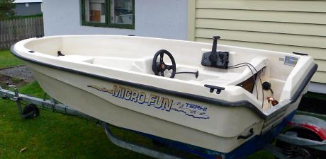 Ein Terhi Micro Fun aus 1997 mit der sagenhaften Länge von 3,20m. Zum Rennsemmel wird das Ganze wenn ich den Honda mit 15 PS einhänge...