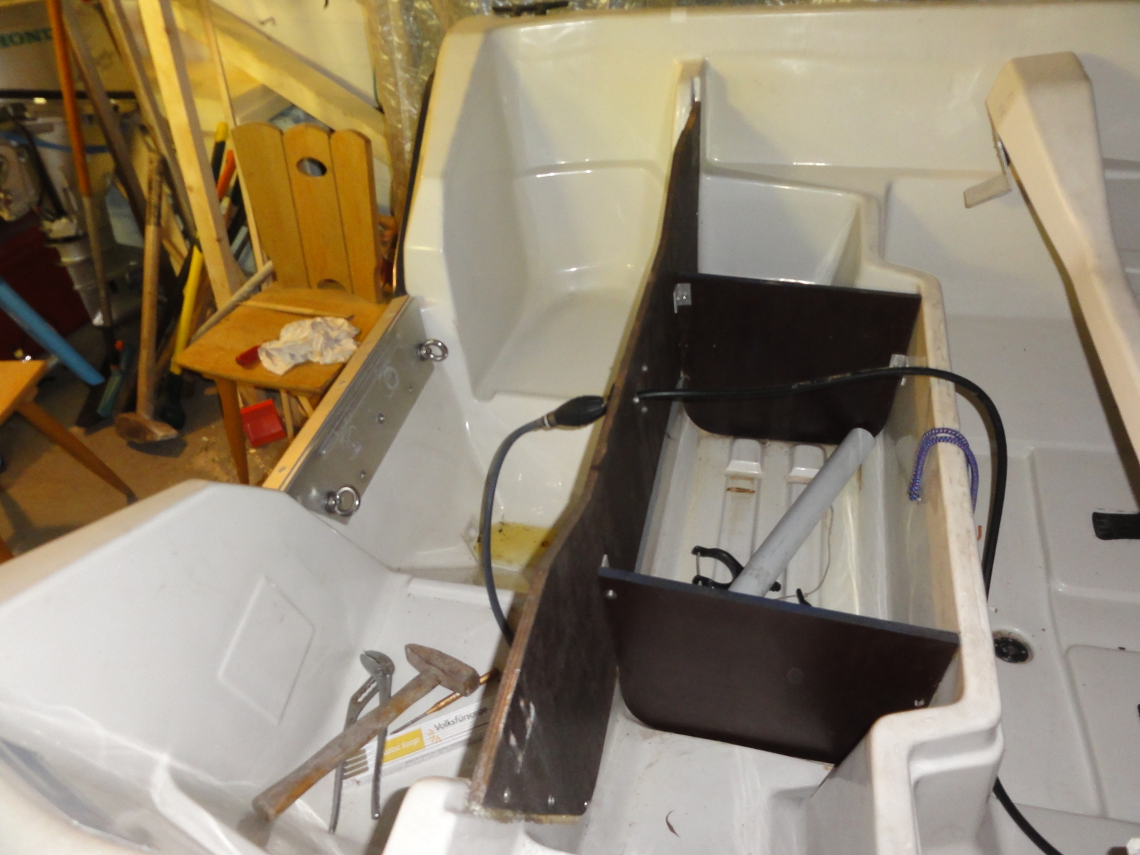 Die Pinnensteuerung klappt so trotzdem, die Einstiegsmöglichkeit einer Welle wird aber um 20cm verringert. Der zweite Teil ist dann der Einbau eines schrägen Deckels (gutes Gefälle zur AB-Auflagerung) im Bereich zwischen Spiegel (Oberkante Motorauflagerung) bis zur neuen Schottwand.