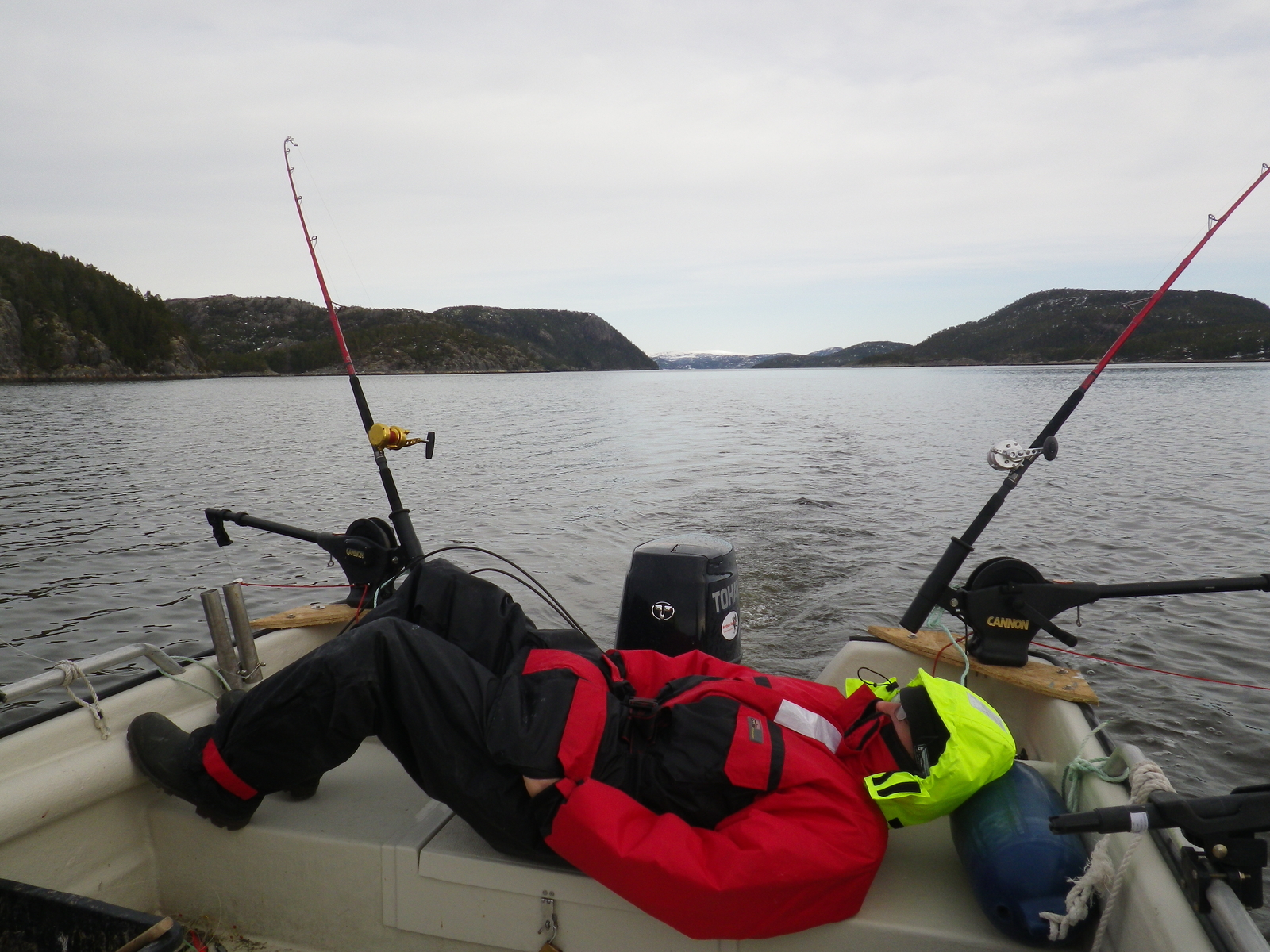 Alternativ fährst Du mit eurem 15 PS Boot und schleppst an den Kanten des Dalsfjords bereits mit tieflaufenden Wobblern an der 10 bis 15 Meter Linie auf Pollack. Dabei steigt auch schon manchmal Lachs oder Meerforelle ein. Wobbler bis 12cm und Lauftiefe 4 - 9 Meter. Am besten vier Ruten, davon zwei im Rutenhalter senkrecht stellen, ca. 30 Meter Schnur mit vorgeschaltetem Mono Vorfach und je eine seitlich in der Hand mit Meerforellen bzw. Lachsblinker mit ca. 2 Knoten schleppen.Gruß