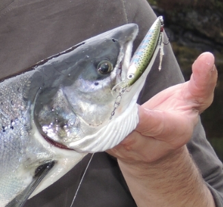 Ich glaube aber nicht, dass es funktionieren würde. Wobei: ich habe einen schönen Lachs auf einen ganz flach geführten 18g Kinetic Salty Mefo-Wobbler knapp unter der Wasseroberfläche gefangen. Vielleicht wäre der auch auf einen Popper gegangen!!???