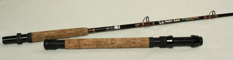 Sie ist zweigeteilt, hat einen schönen langen Korkgriff und 8 gut verarbeitete Ringe. Die Länge ist 2,10m und die Rute ist 50lbs-Klasse.