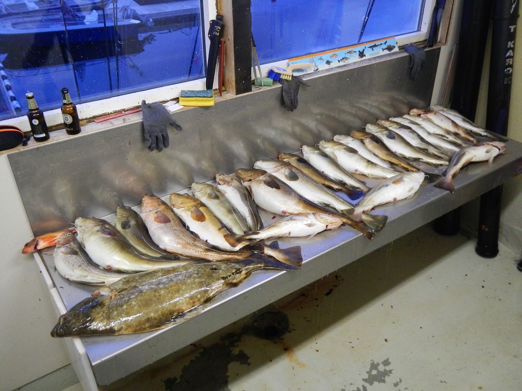 Der heutige Tag war bisher von den Fischgrößen her der erfolgreichste Tag. Wir konnten trotz dem aufgefrischten Wind trotzdem noch einmal bis Leksa fahren und die Buchten abklappern. Wir wollten es heute gezielt auf Heilbutt versuchen. Wir montierten ausschließlich Gummifische und suchten die verdächtigen Stellen ab. Jens konnte dann auch gegen 12 Uhr einen Heilbutt von 87cm und 8 kg landen. Weitere Buttkontakte blieben dann aber aus. So suchten wir die Unterwasserberge nach Dorschen ab und konnten einige schöne Fische um 70 cm landen. Zum Abschluss fuhren wir dann noch einmal auf das sandige Plateau vor Stora. Dort konnten alle noch einmal schöne Dorsche zwischen 65-85cm fangen. Insgesamt konnten wir also einen Heilbutt und 23 Dorsche in guten Größen für den 4. Tag verbuchen. Wir sind gespannt, was morgen kommt....! ;)