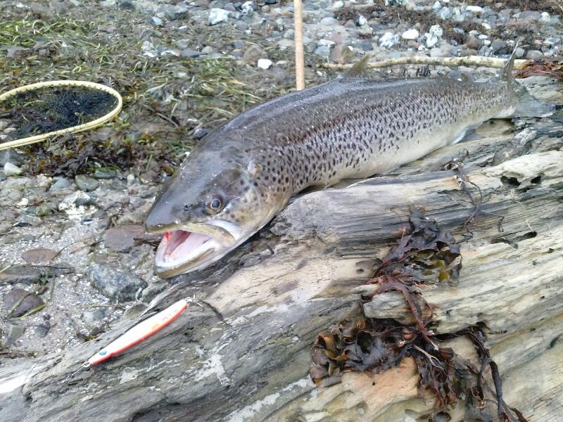 Wir waren bei auflandigem Wind, Nebel und leichtem Nieselregen zwei Stunden im Wasser. Wir konnten 11 Meerforellen fangen, wovon 10 maßig waren! Mit nach Hause durfen jeweils 2! (die Schwiegereltern werden sich freuen