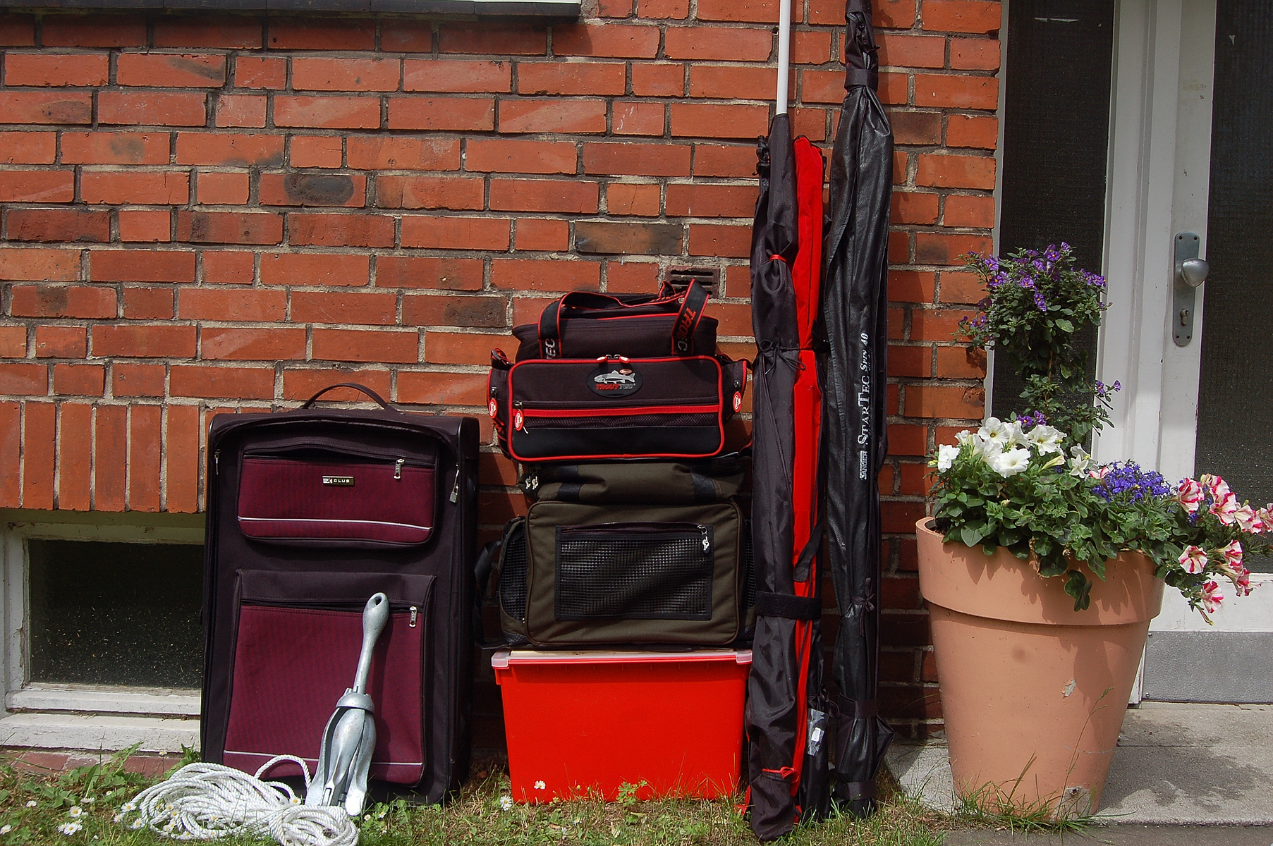 Ich hab entschieden das mein Brandungsrutenhalter fürs Ufer-Angeln zu Hause bleibt! in den beiden Taschen sind Pilker und Co untergebracht im selbst gebastellten Filitiereimer sind die Rollen untergebracht. fehlt nur der Floater und die Automatikweste,die hab ich dann mal nach dem Kauf 2008 das erste mal zur Wartung gebracht,die wollten die erst nicht zur Wartung annehmen da ich 2 wartungen nicht gemacht hatte aber als sie den äußeren Zustand gesehn haben (wie gerade gekauft)ging das dann doch. Nimmt eigendlich jemand fürs Uferangeln einen Unterfangkescher mit?