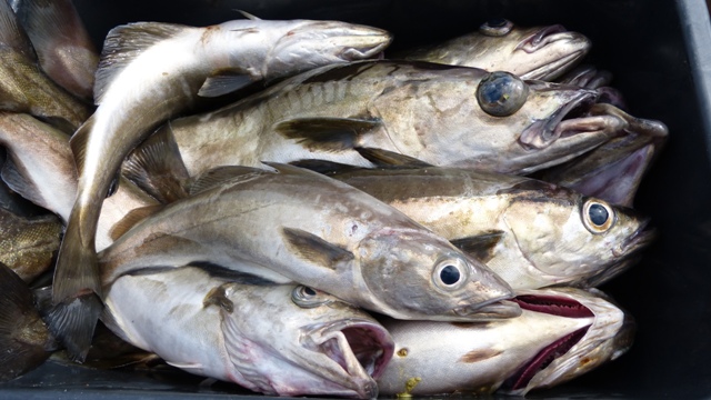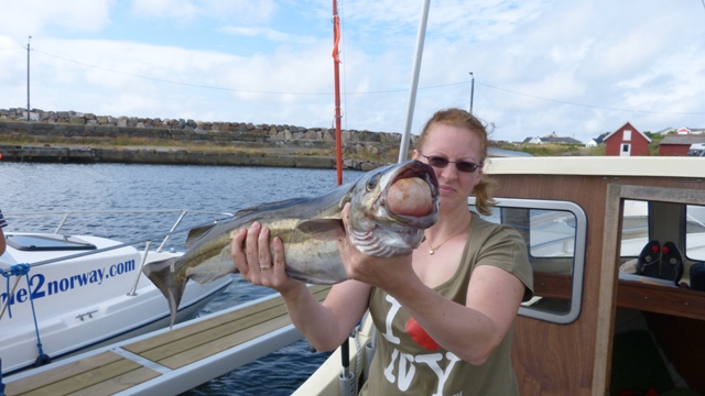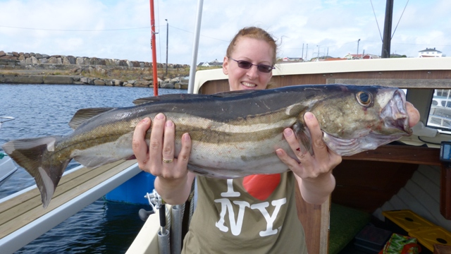 An der bekannten Pollackstelle angekommen, ging es auch gleich voll los, beim ersten Runterlassen gleich Fischkontakt im Mittelwasser. Es waren die Seelachse, allerdings noch eine Nummer zu klein. Dann gesellten sich Makrelen und auch die ersten Pollacks dazu. Trotz des Windes und der hohen Wellen hatten wir mit dem Kutter fast keine Drift und konnten lange über der Stelle stehen bleiben. Bei Angeltiefen um 80 bis 90 mtr. gingen die 80er und 100er Pilker gerade runter....Nachdem ich dann ein paar gute Pollacks aus den Tiefen gezogen habe, sprang Tina auf und sagte: So jetzt aber Angel und gelb/orangen Pilker her, ich will Angeln... und es kam wieder wie es kommen mußte, gleich beim zweiten hochkurbeln hat sie meine Fische gleich wieder mit einem 95er Pollack mit knapp 5 Kg getoppt und mich schön verangelt. Dann war ich wieder am Zug und fing zwei drei, bis sie wieder aufschrie und die Bremse voll abzog. Diesmal war es ein 87er mit 4,3 Kg !!! Ich glaube ich habe sie mit der Pollackangelei angesteckt.