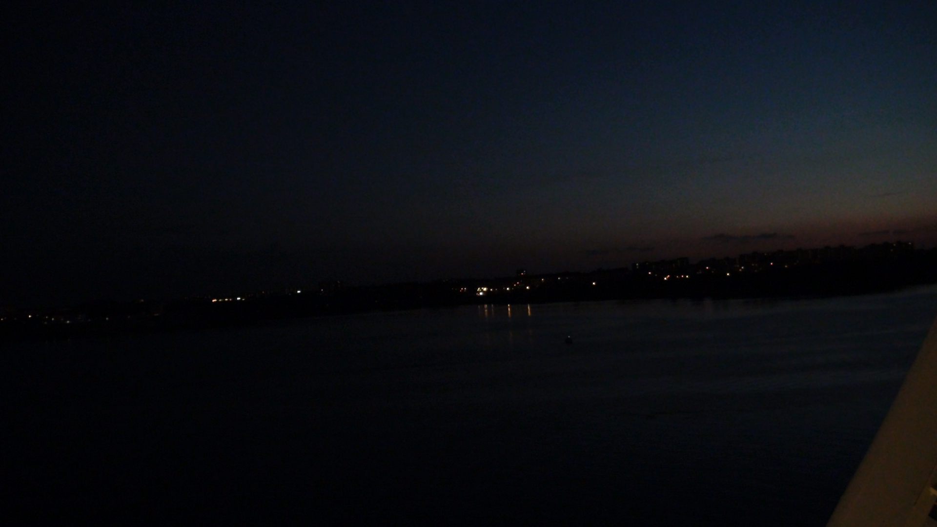 Man sah die Lichter der Stadt Rostock. Wir fuhren an der Neptun- Werft und an der Warnow- Werft vorbei, ehe wir aufs offene Meer kamen.