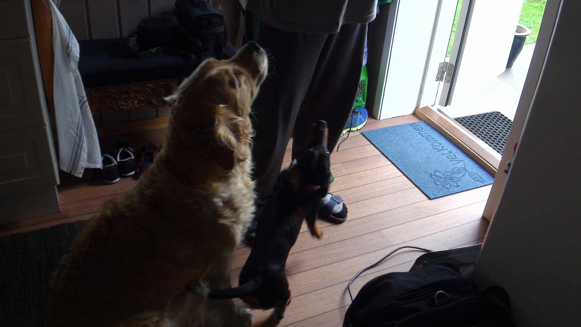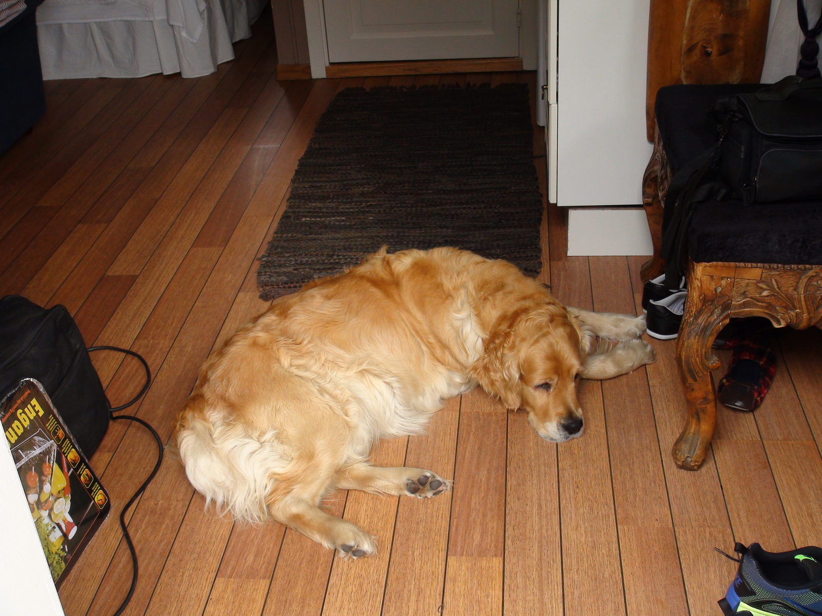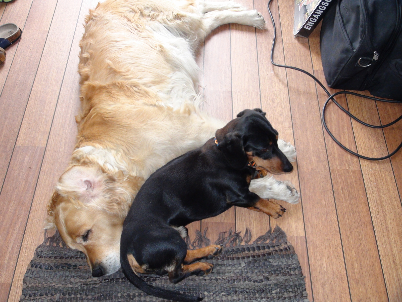 Als wir im Hof angekommen waren, gab es erstmal eine tierische Begrüßung. Der Golden Retriever Panjo kam angewackelt und begrüßte uns schwanzwedelnd. Er ist ein unheimlich lieber Hund und auf die Tiere hat sich besonders Dani schon sehr gefreut. Doch da kam ja noch so ein Kläffer angeflitzt. Es war der einjährige Kurzhaardackel namens JÜRGEN. Was für ein Name für ein Hund!!!!!! *rolleyes* Ja, wir mußten auch nochmal nachfragen. Er war sehr ungestüm und sprang uns gleich vor Freude an. Erst danach ließen die Hunde es zu, dass wir unsere Vermieter Kate und Odd begrüßen konnten. Auch diese Begrüßung war sehr herzlich, da wir uns ja schon kannten. Über unsere Gastgeschenke haben sie sich sehr gefreut. Sogar an ihren Hund und die Katze haben wir gedacht und Leckerlis mitgebracht. Nur wußten wir nicht, dass es jetzt einen zweiten Hund gibt. Egal, es reicht für alle!!!