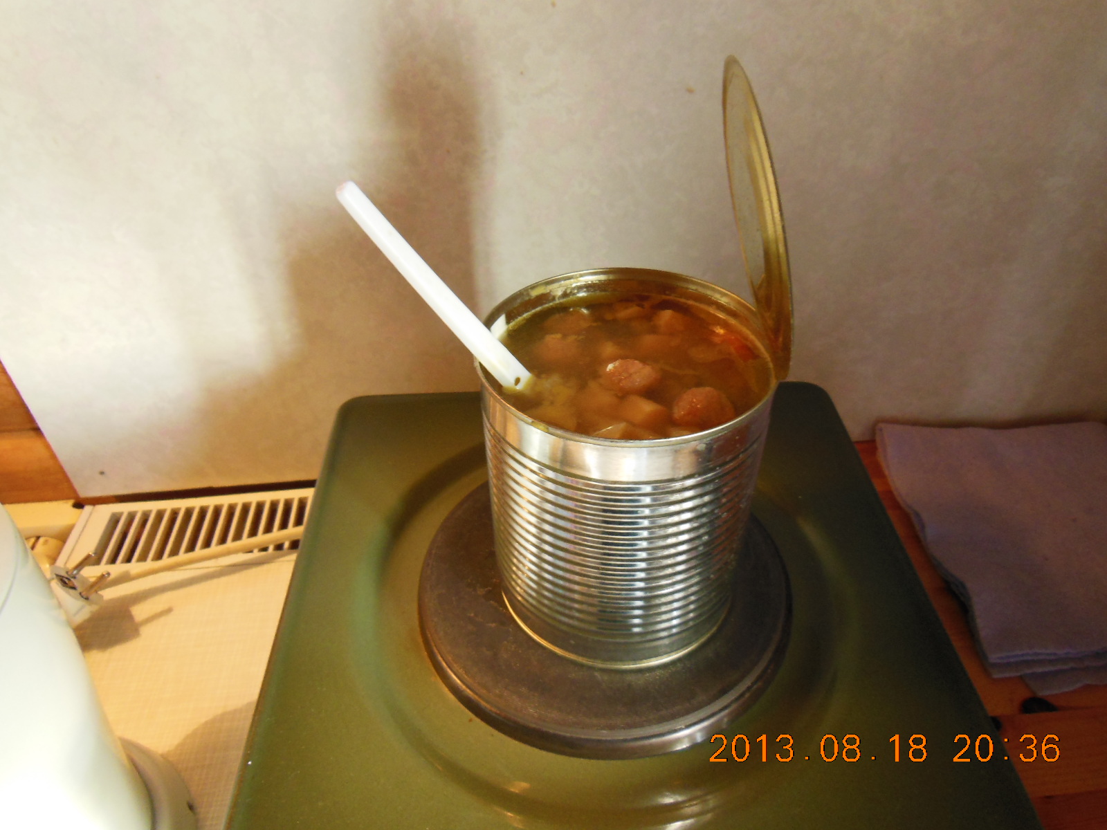 Wir sind in der Hütte auf dem Campingplatz angekommen! Schatz hat mich in die Kochweise von Jungs eingewiesen, welche ohne Mädels unterwegs sind. Es gab zum Abendessen einen Eintopf, gekocht direkt in der Büchse auf der kleinen Elektroherdplatte. Es war sehr lecker, den Abwasch übernahm der Mülleimer. Dank dem Pappgeschirr, welches wohl jeder kennt.