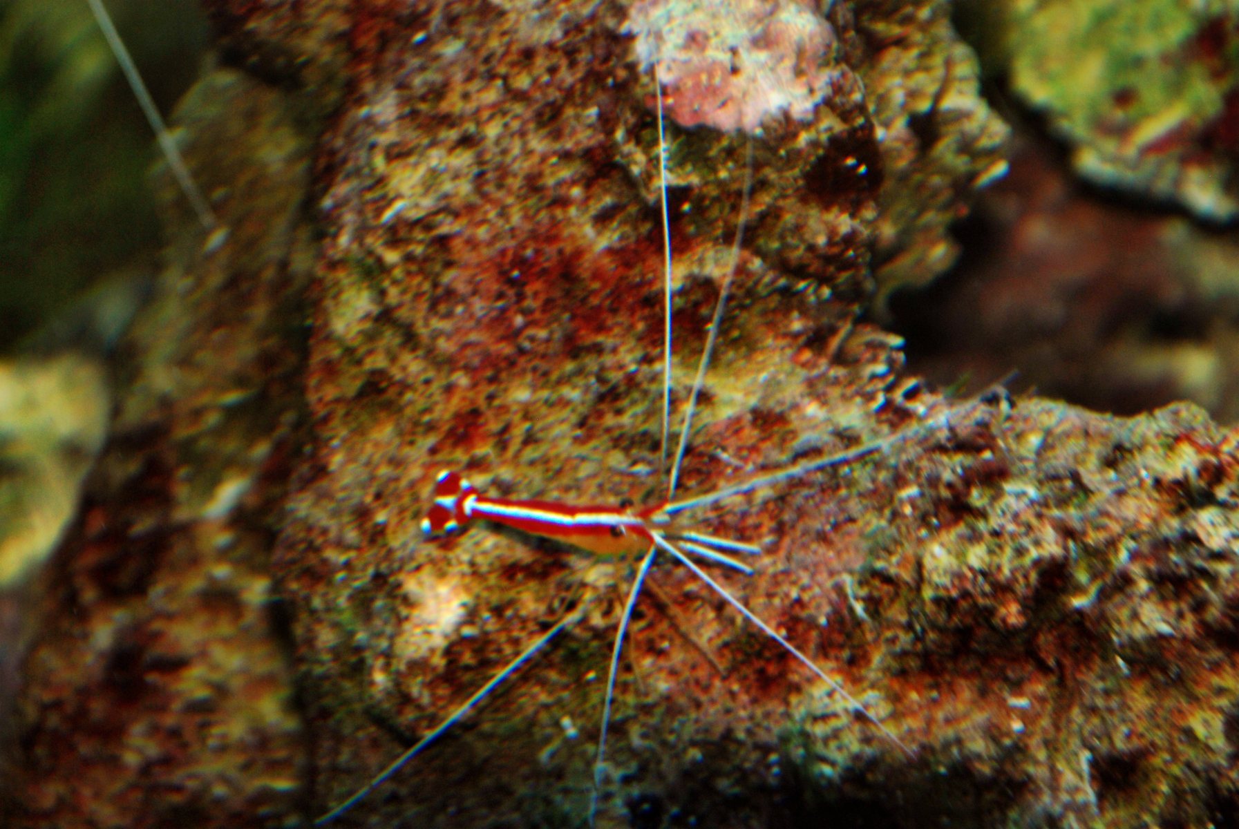 Die zu sehende kleine Garnele ist eine von zwei Langstreifen Putzergarnelen