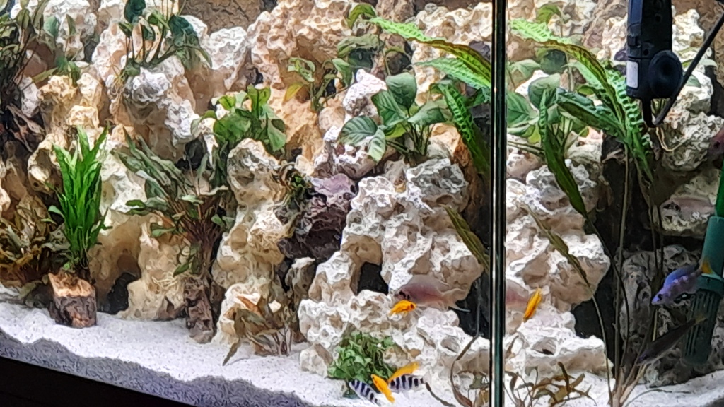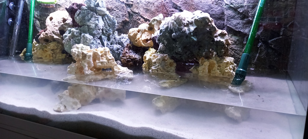 Was macht man wenn mann plötzlich hunderte kleiner Spitzhornschnecken im Becken hat und die nicht mehr los wird. Also vom Kumpel 2 große Wannen geliehen,Wasser aus dem Becken rein gepumpt und Fische und Pflanzen umgesetzt.Alle Felsen raus und in die Badewanne und erstmal 2 Stunden in heißem Wassser belassen,die künstliche Stein Rückwand von den kleinen Biestern mit einer harten Bürste befreit und dann restlos den Kies entsorgt.Jetzt sind 40Kilo feiner Sand drin den mögen meine Sandchichliden ohnehin am liebsten.Die Felsen neu mit Anubias bepflanzt.