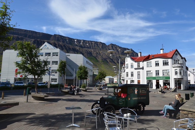 Diesmal steigen Martin und Herbert schon am Orteingang von Isafjördur am Bonus-Markt aus und gehen dort einkaufen (Preise ganz ungewohnt günstig; ähnlich bei uns in Deutschland, und die Auswahl auch deutlich besser als im Einkaufsmarkt direkt im Ort; allerdings auch stark frequentiert, wie Martin und Herbert anschließend berichten…)