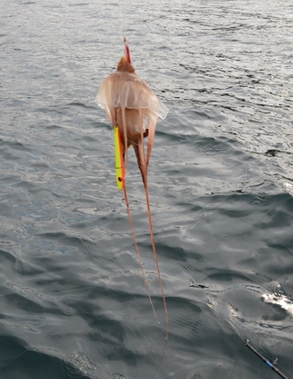 Eine große Qualle hing an dem unteren Einzelhaken des Paternosters. Bis dahin dachte ich eigentlich, dass man eine Qualle nicht haken kann! Wie man sieht, wurde ich von Gegenteil überzeugt. Mit einer Zange und ohne es zu berühren wurde das klitschige etwas wieder vom Haken befreit.