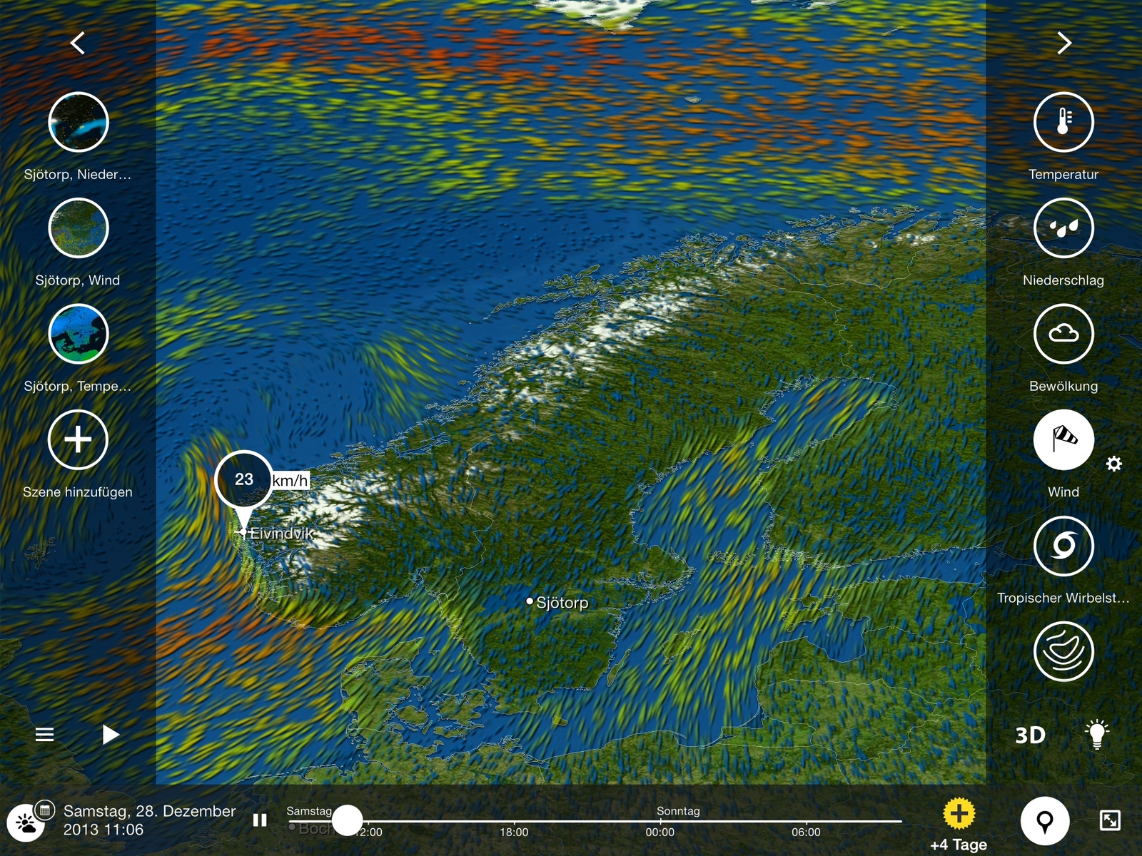 Erstmals können Sie sich wie im TV-Wetterbericht Animationen zu Wind, Bewölkung, Temperatur etc. anschauen – nahezu in Echtzeit und in einer 24-Stunden-Vorhersage. Tauchen Sie ein – in Ihre ganz eigene Wetter-Show – mit MeteoEarth!