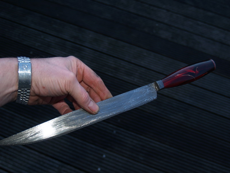 Für denPreis bekommtman dann auch schon selbstgeschmiedete Damastmesser in super gutem Benannten Stahl.Hier mal nur ein Beispiel von einem Fleischmesser in 27 cm Klingenlänge.