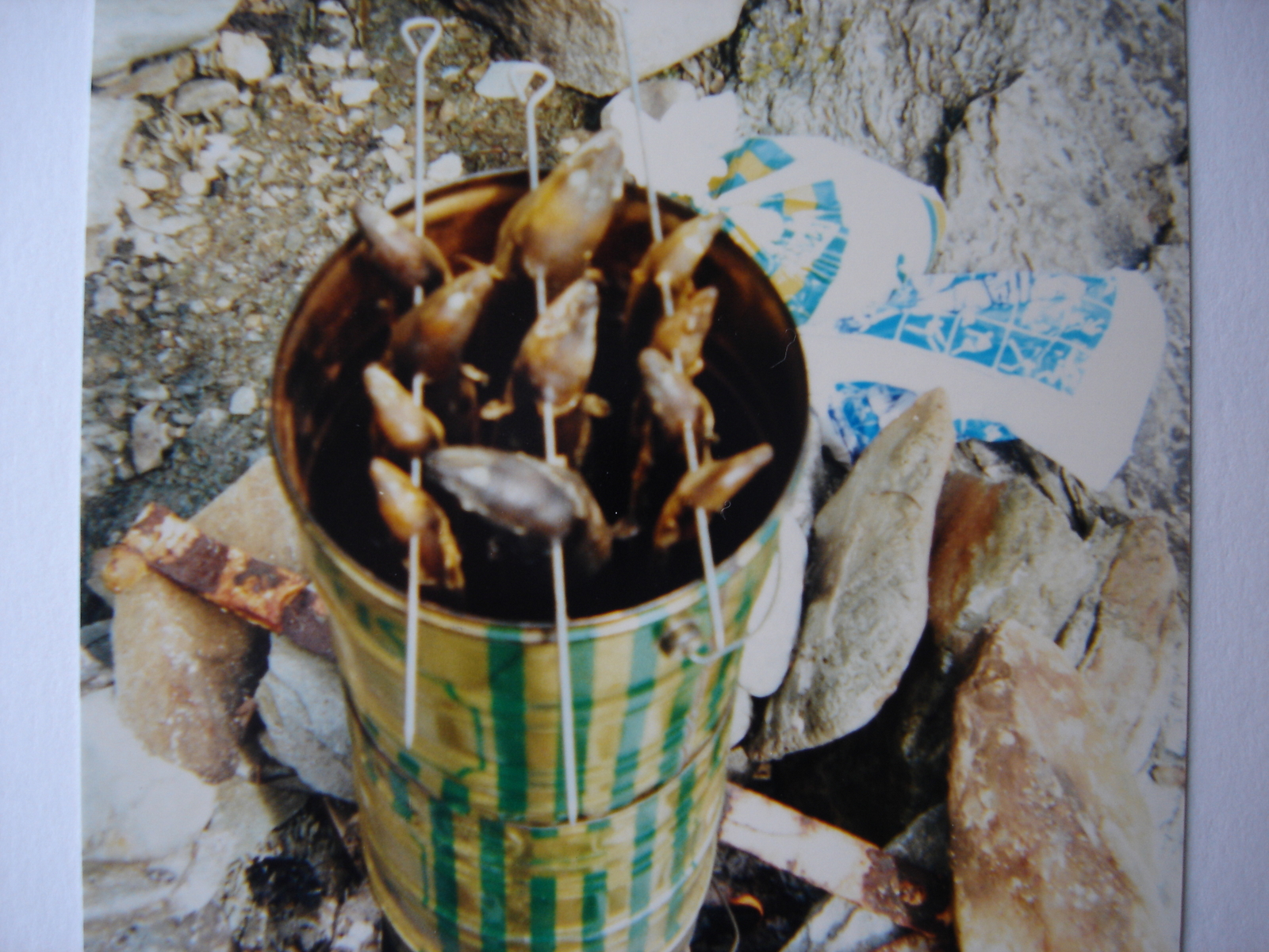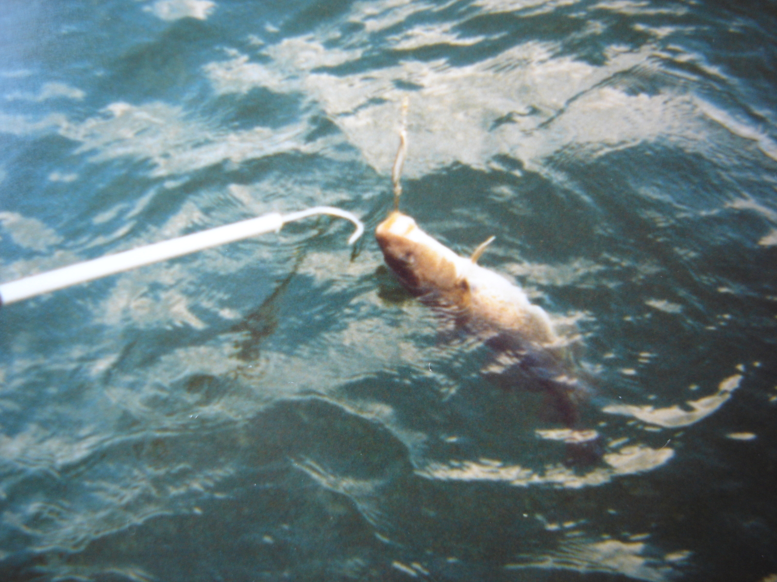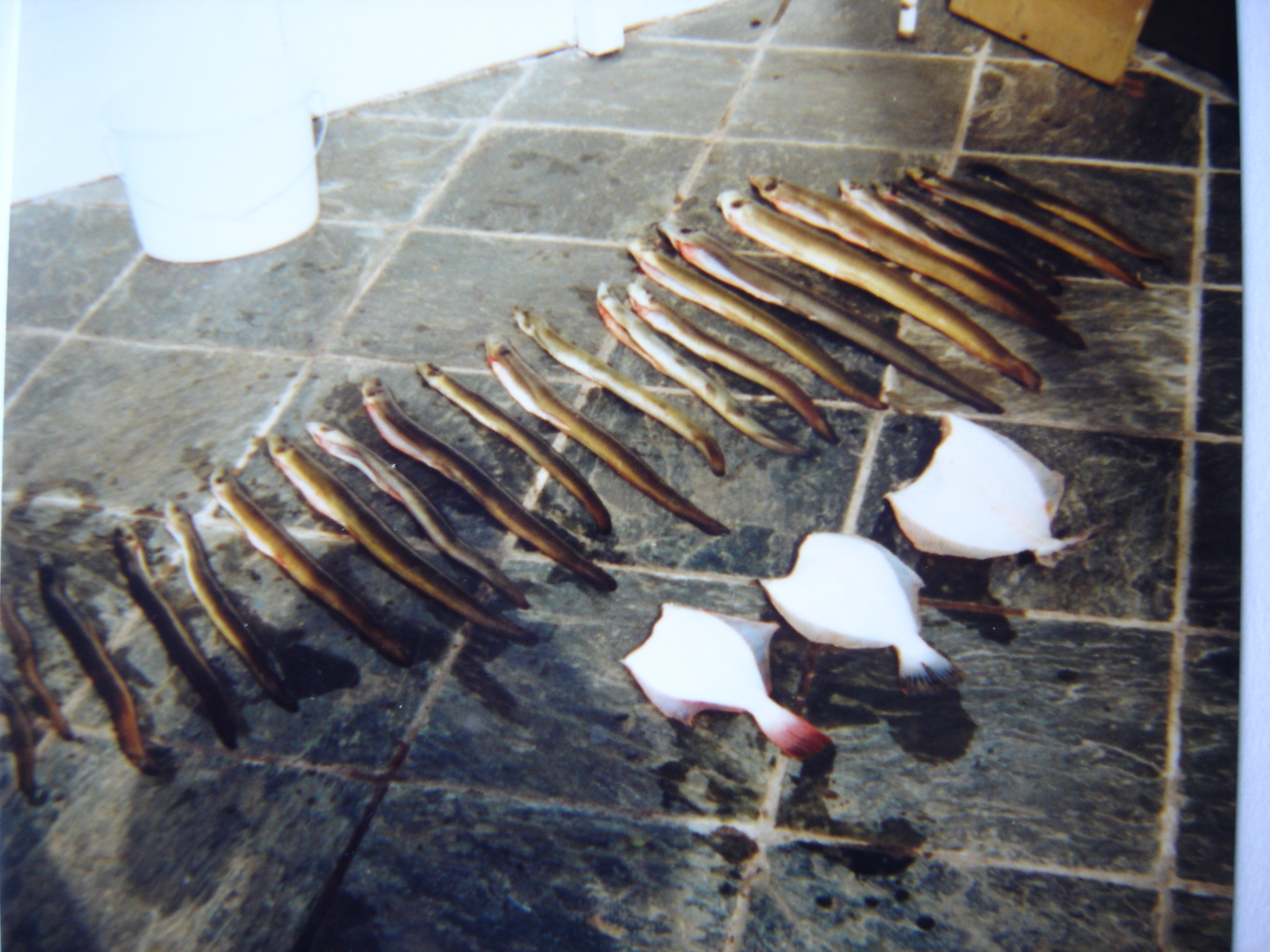 Damit standen uns nun auch neue Möglichkeiten offen, Dorsch und Pollak nachzustellen. Echolot oder GPS, Kartenplotter oder Seekarten, alles Fremdworte für uns zur damaligen Zeit. Das hielt und aber nicht davon ab, den ein oder anderen schönen Fisch zu überlisten. Auch vom Ufer aus gab es tolle Fische, besonders die Aale hatten es uns angetan (damals gab es so etwas wie Aal-Fangverbote noch nicht). Aal aus dem Salzwasser, eingelegt und frisch geräuchert, lauwarm verspeist – was gibt es schöneres. Manch einer fragt sich jetzt vielleicht, hat das Haus einen Räucherofen gehabt – nein, selbst ist der Mann. Drei große Marmeladeneimer, von denen bei zweien der Boden ausgeschnitten ist aufeinander gesteckt, zwischen Steinen eine Feuerstelle mit zwei Metallstangen drüber, Buchenspäne in den Eimer und dann über das Feuer. Die Aale auf Spießen von oben in die Eimer gehängt, mit einem großen Teller und Tüchern abgedeckt, funktioniert prächtig! Einfach lecker!!! ![]()