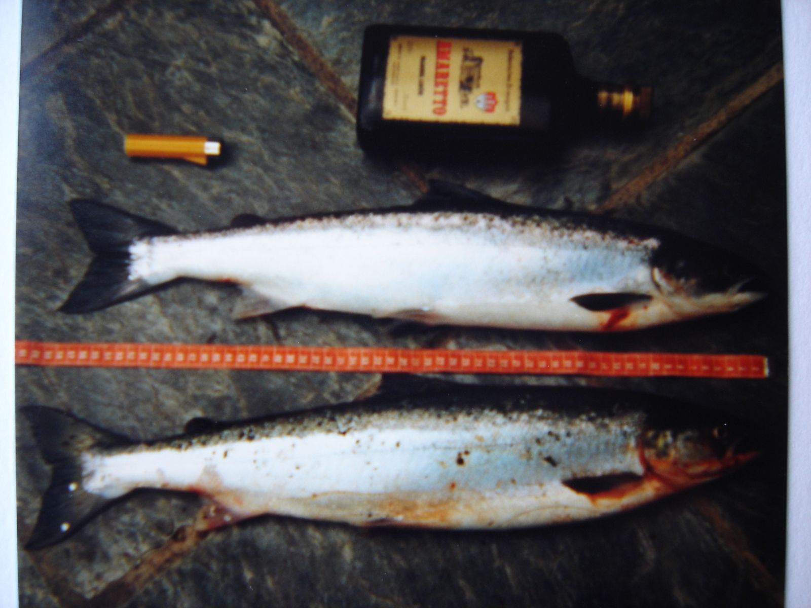 Ein anderes Erlebnis, welches mir noch sehr gut in Erinnerung geblieben ist, spielte sich wieder im Süßwasser ab. An einem relativ kleinen Fluss kamen wir an eine Brücke, hinter der ein recht großes, tiefes Becken lag. Im glasklaren Wasser konnten wir einige Forellen und auch zwei schöne Lachse stehen sehen. Ohne Erlaubnis, wussten wir ja, darf man keine Lachse in den Flüssen fangen. Ein Plan in Andi´s Kopf reifte jedoch schnell heran und wurde in die Tat umgesetzt. Kurze Rute, kein Blei, schöner Drilling, dickes Wurmpäckchen drauf und den Lachsen von der Brücke vor die Nase gehalten. Keine 5 Minuten, und die beiden Lachse lagen zu unseren Füßen – einige hundert Meter entfernt öffnete sich die Tür eines Bauernhauses und ein Norweger kam zügigen Fußes in unsere Richtung marschiert *eek*. So schnell war noch nie in meinem Leben eine Rute zusammengepackt, der zweite Lachs noch am Haken, zwar schon getötet aber noch nicht mal gelöst, das ganze „Gerödel“ nur locker gepackt und in den Kofferaum geschmissen – ab dafür! Adrenalin lässt grüßen…