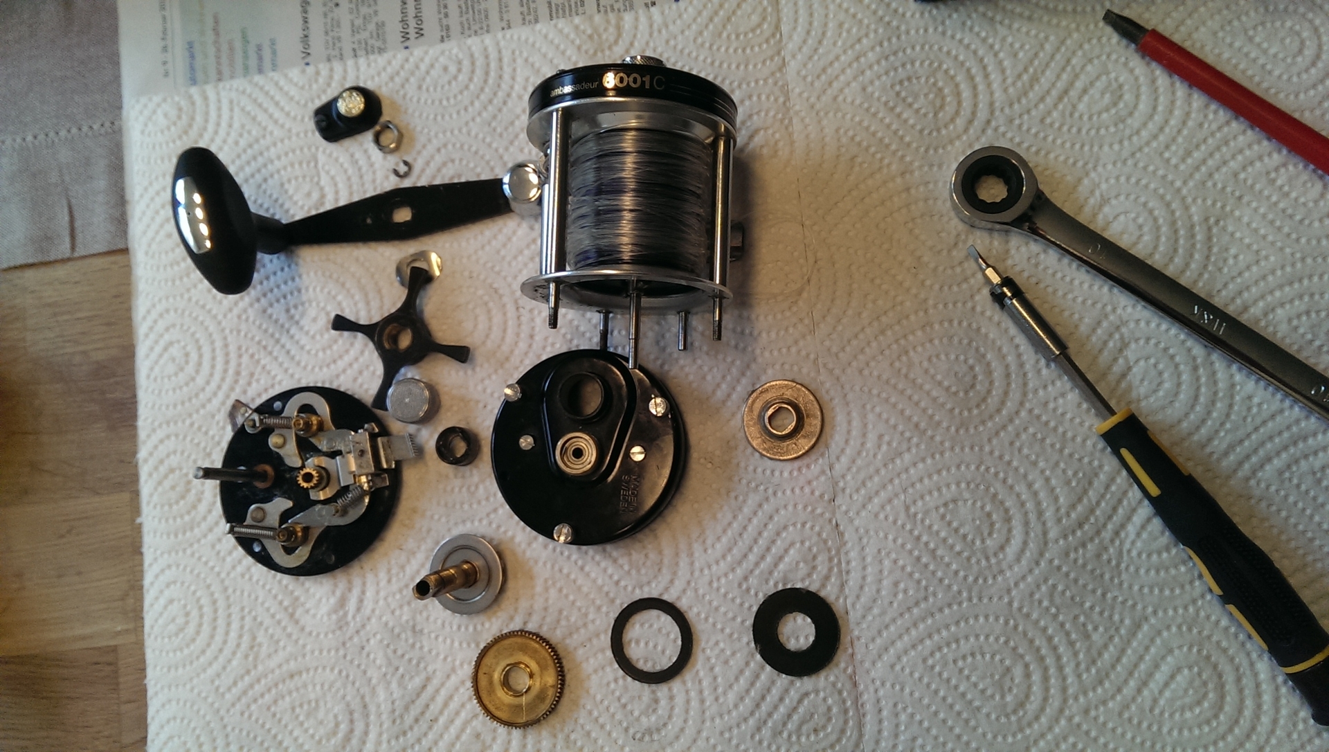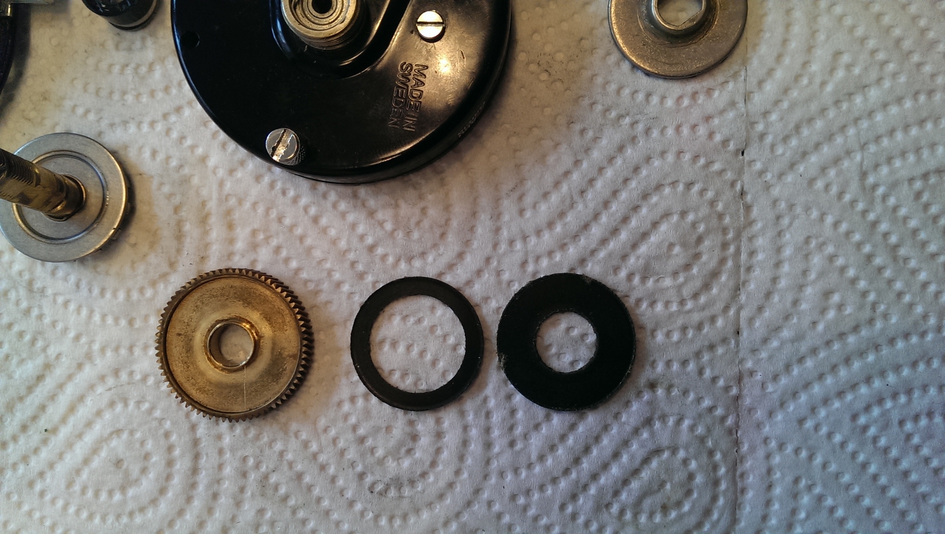 Ein ABU 6001? Muss entweder ein 6501 oder 6601 sein. Aber dennoch sollte der 3 scheiben haben. Die scheibe die du gefunden hast, ist ein delrin (teflon-art) scheibe. Sind noch welche im zahnrad zu finden.