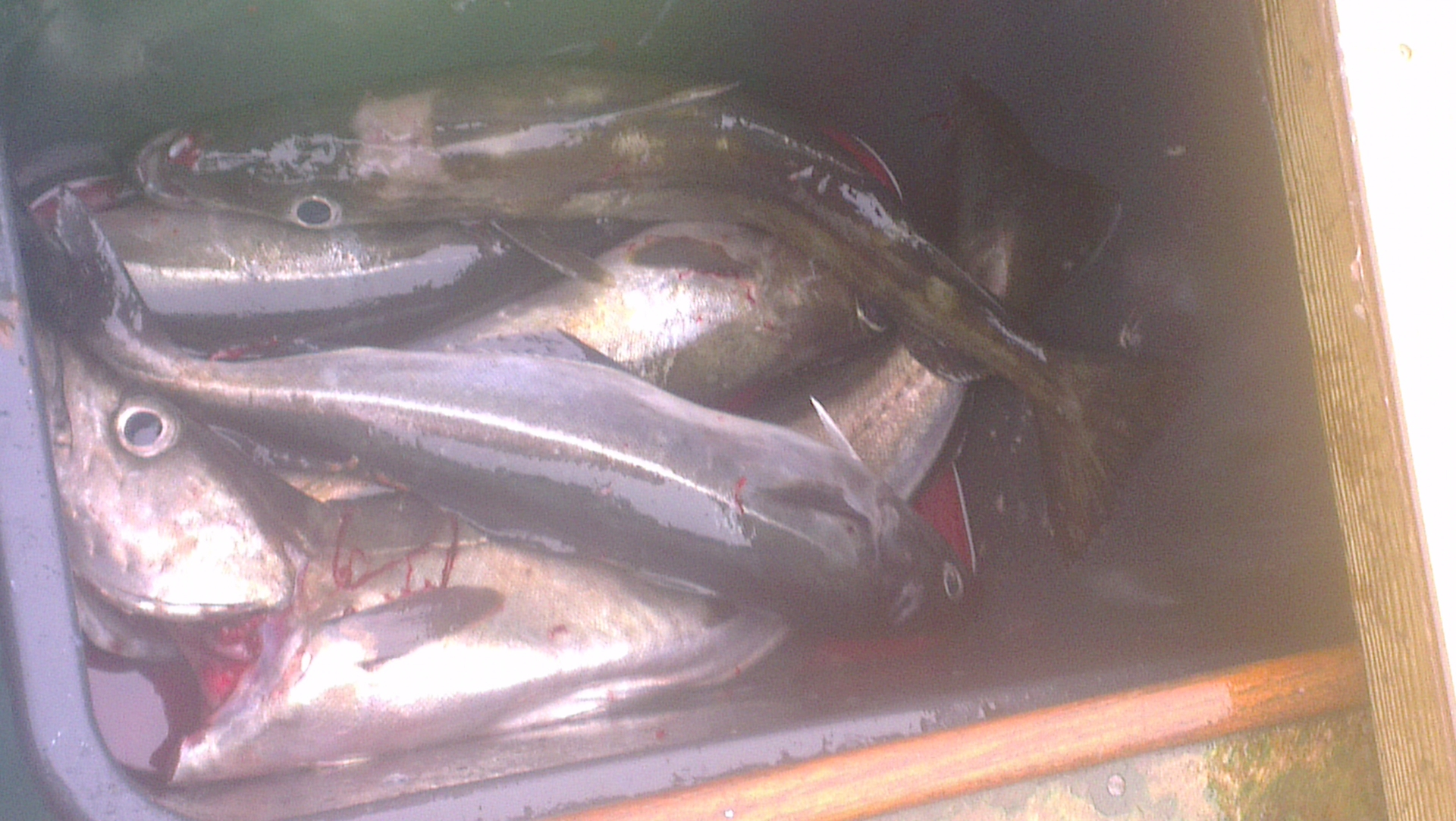 Gleich an die 50m Linie und Richtung Plateau, ein kurzer Zwischenstopp, war aber nur wenig Erfolg, dann weiter direkt zum Punkt LP3, dort angefangen zu kreuzen und nach kurzer Zeit war die WAND da, der absolute Hammer - Tiefe gut 84m die Wand stand zwischen 40m und 60m, immer bei 50m Linie angesetzt, Drift bis 100m Linie und wieder zurück, dies Spiellchen gut 2 Std lang. Wir haben nur mit einem einfachen Pilker geangelt 100gr. - 125gr. ohne Tannenbaum, einfach runter und im Absinken - rums Köhler bis 2,5 Kg -, wenn einer von uns mal durch Zufall unter den Schwarm kam - rums Pollack bis 4 Kg oder vereinzelt Dorsch auch bis 3 Kg - . Ich hab es dann mal mit Makrelenfetzen am Pilker versucht, ist jetzt kein Witz, ich bin genau in der Zeit zwei mal auf den Grund gekommen und kurze Zeit später, na was wohl - rums zwei mal Leng, einer 2,5 Kg, der andere 4,5 Kg.