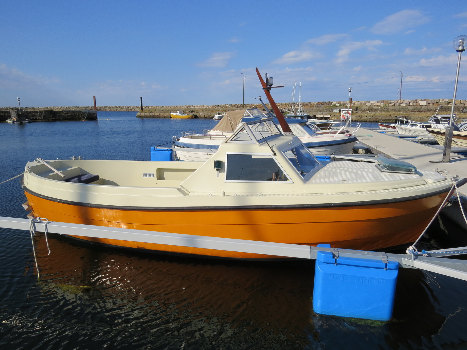 Zu den Bilder: Borhaug im Sonnenschein, Tom und Andy müssen wieder als Fotomodelle herhalten, und das gelbe 26 ft. Boot ist das neue Reserveboot vom Sildebua.