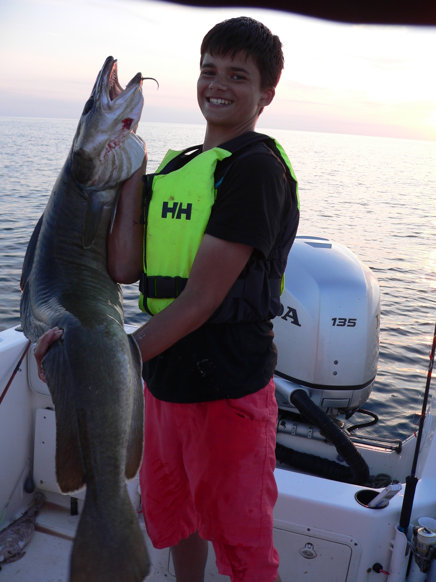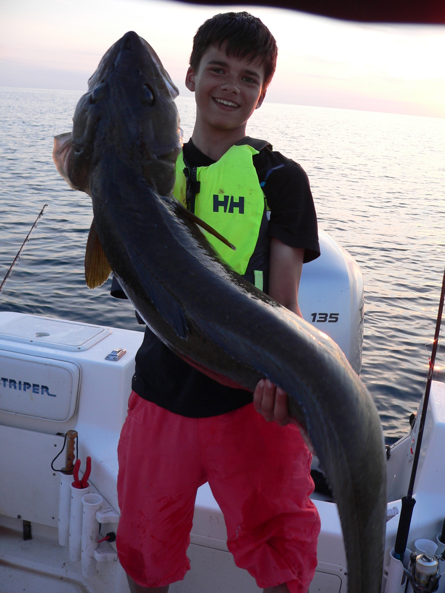 Heute Abend ging es noch ein wenig aufs Meer. Bei tiefstehender Sonne konnten wir in nur 40 Meter Wassertiefe binnen kürzester Zeit schöne Leng von 100 - 130 cm fangen. Seht selbst... PS: Wir haben auch Bilder mit Massband und Waage.