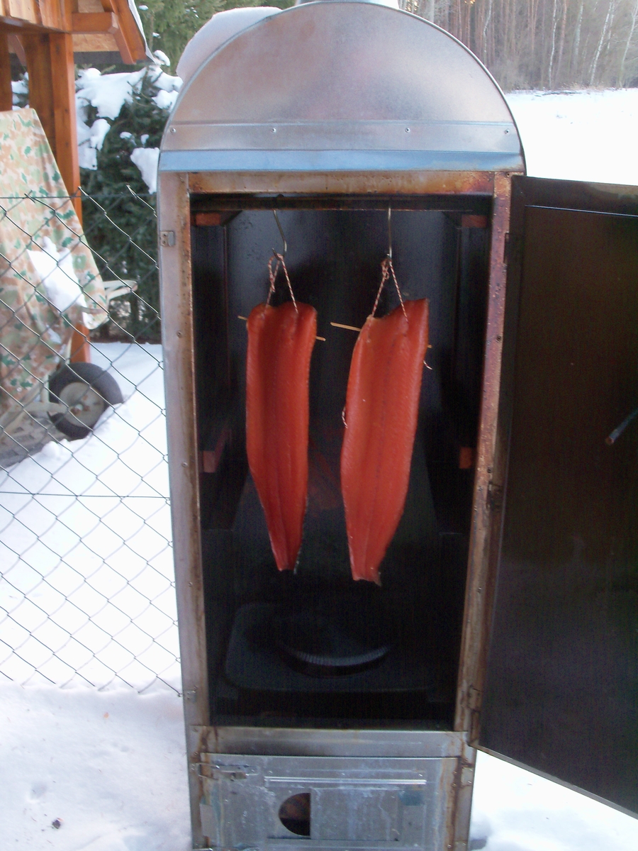 Dann wird das Teil eingeräuchert. Ohne Fisch. Ich werde davon auf jeden Fall berichten. Wenn alles passt, kommen für meine Frau zwei Forellen rein. (Ich esse die nicht *rolleyes* )