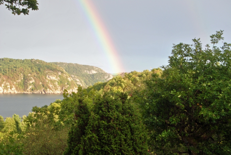 Der Tag heute war ein recht ruhiger. Das Boot ist klar, nur die erste Ausfahrt wurde durch ein drohendes Gewitter gestoppt. Nach einer Stunde stellte sich raus, dass es doch kein Gewitter der norwegischen Art war. Ein Donner und etwas Regen, mehr war es nicht. Danach ein schöner Regenbogen über dem Fjord.