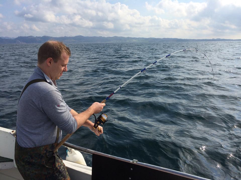 Auch sind schon die ersten schönen Fische gefangen worden, ein Dorsch von knapp einem Meter ist derzeit der Spitzenreiter. Alle bisher gefangenen Lengs liegen noch unter 1 Meter, die Pollak bewegen sich zwischen 40 und 95 cm. Makrelen sind im Überfluss vorhanden. Einige müssen sich noch auf die neuen Angelmethoden einstellen, da wir hier auf dem offenen Meer in größeren Tiefen fischen, und nicht im Fjord.