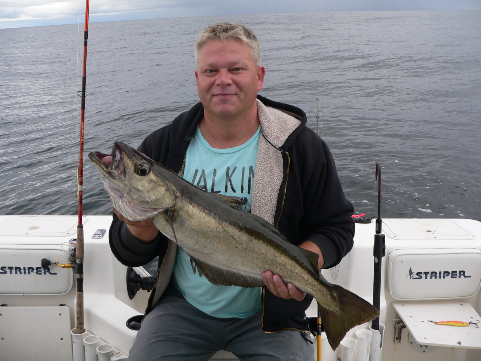 Auch sind schon die ersten schönen Fische gefangen worden, ein Dorsch von knapp einem Meter ist derzeit der Spitzenreiter. Alle bisher gefangenen Lengs liegen noch unter 1 Meter, die Pollak bewegen sich zwischen 40 und 95 cm. Makrelen sind im Überfluss vorhanden. Einige müssen sich noch auf die neuen Angelmethoden einstellen, da wir hier auf dem offenen Meer in größeren Tiefen fischen, und nicht im Fjord.