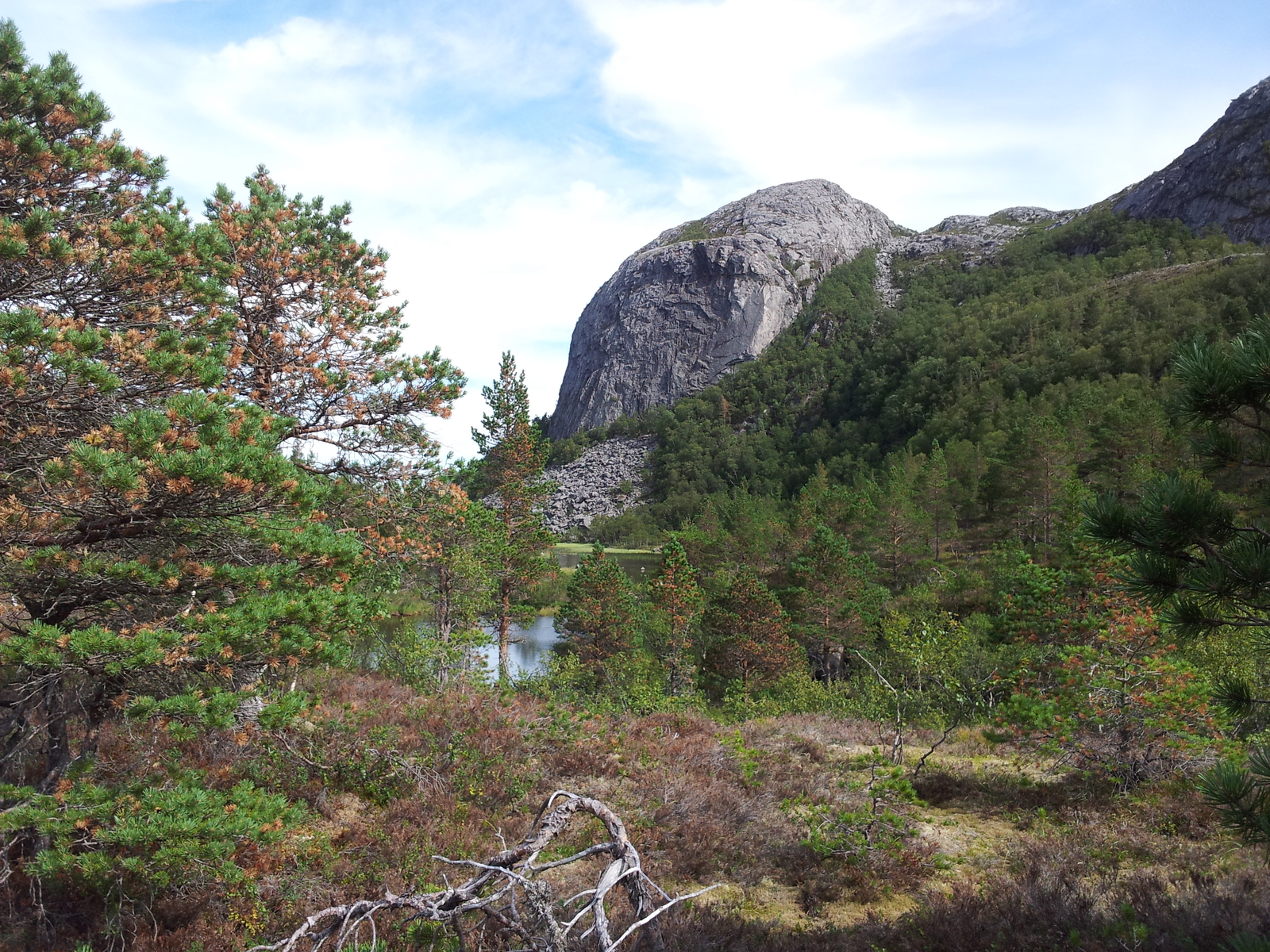 Und dann kam er. Mein Tag! Der 13. August begrüßte uns mit traumhaftem Wetter und wir überlegten, was wir wohl machen könnten. Schlussendlich beugte sich meine Frau der Mehrheit und wir beschlossen mal so eine richtige Outdoor Wanderung zu unternehmen. Die Selnesheia erhebt sich direkt neben dem Fjord und war demzufolge ohne Umwege zu erreichen. Durch Sverre unseren Vermieter hatten wir auch eine (selbstgemalte) Karte, die uns den Weg auf diese kleine Hochebene zeigte. Anfangs fanden wir einen richtig guten alten Almweg vor. Aber als wir oben ankamen, hieß es sich den Weg zu bahnen bzw. zu suchen. Dabei ging es durch sumpfiges Gebiet, über kleinere Bäche und durch zahlreiche Birkenhaine. Also so richtiges Elchgebiet. Meine Frau sah uns vor ihrem geistigen Auge schon vor Elchen flüchten oder im Morast versinken. Doch nichts von dem trat ein. Einfach nur Natur, aber so richtig. Es war einfach grandios sich so klein zu fühlen und in dieser intakten Natur zu stehen. Na jedenfalls für mich. Als es dann an den Abstieg auf der anderen Seite des Hanges ging, fielen meiner Frau fast die Augäpfel raus. Da baumelte an einer etwas steileren Wand ein Seil, andem wir runter mussten. In dem Moment glaubte ich in den Augen meiner Frau Mordgedanken erkennen zu können. Aber auch diese Passage meisterten wir und erreichten am frühen Nachmittag unsere Hütte. Unsere kleine Maus war völlig fertig, wir aber auch.