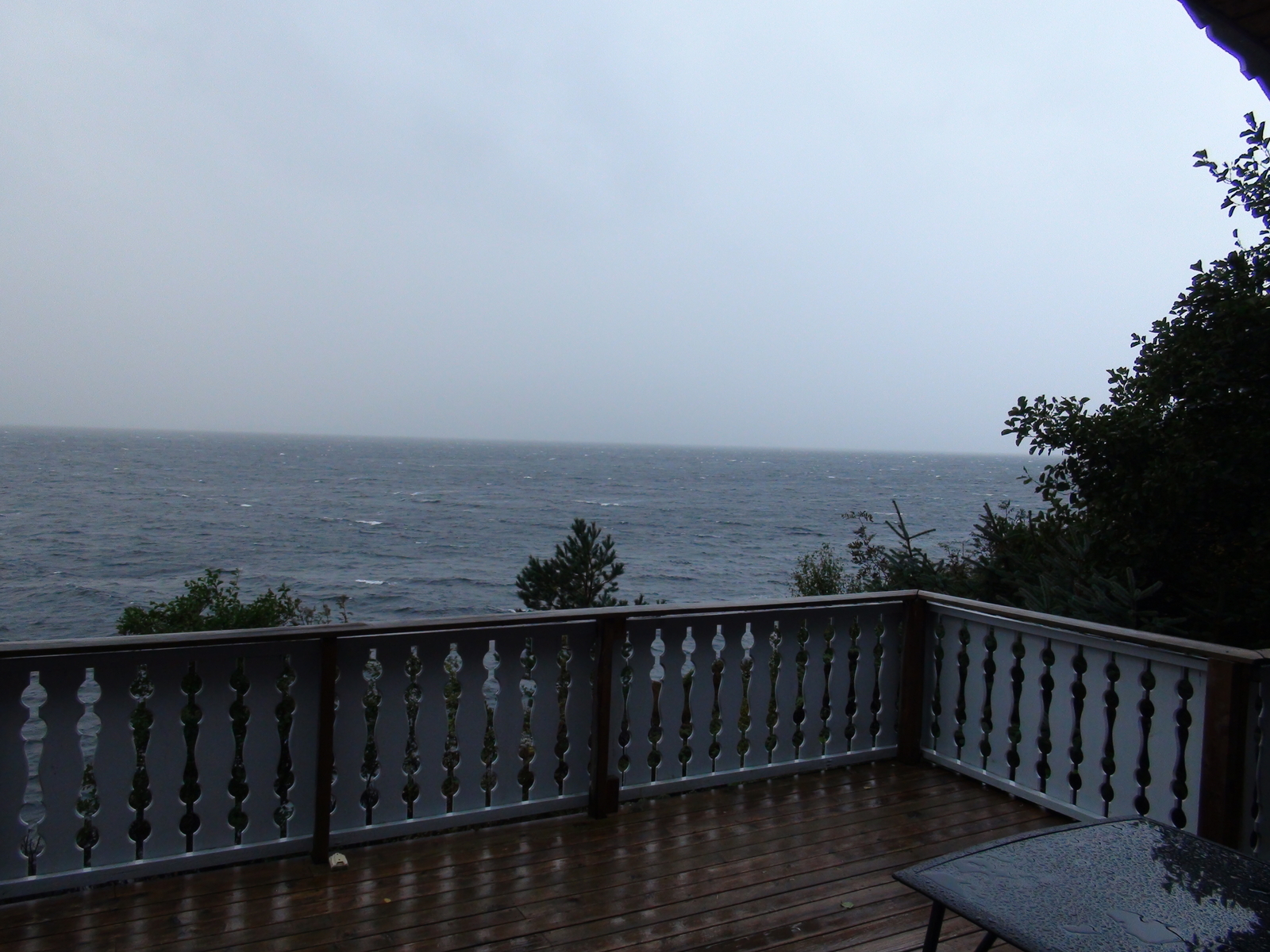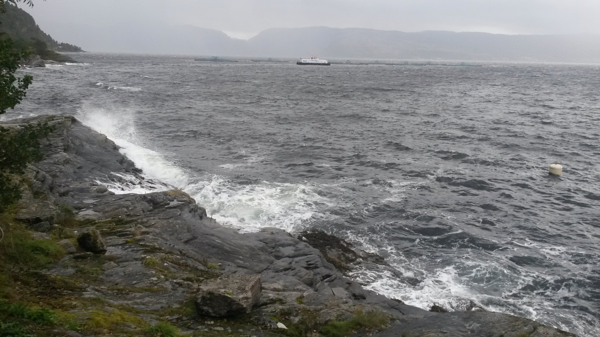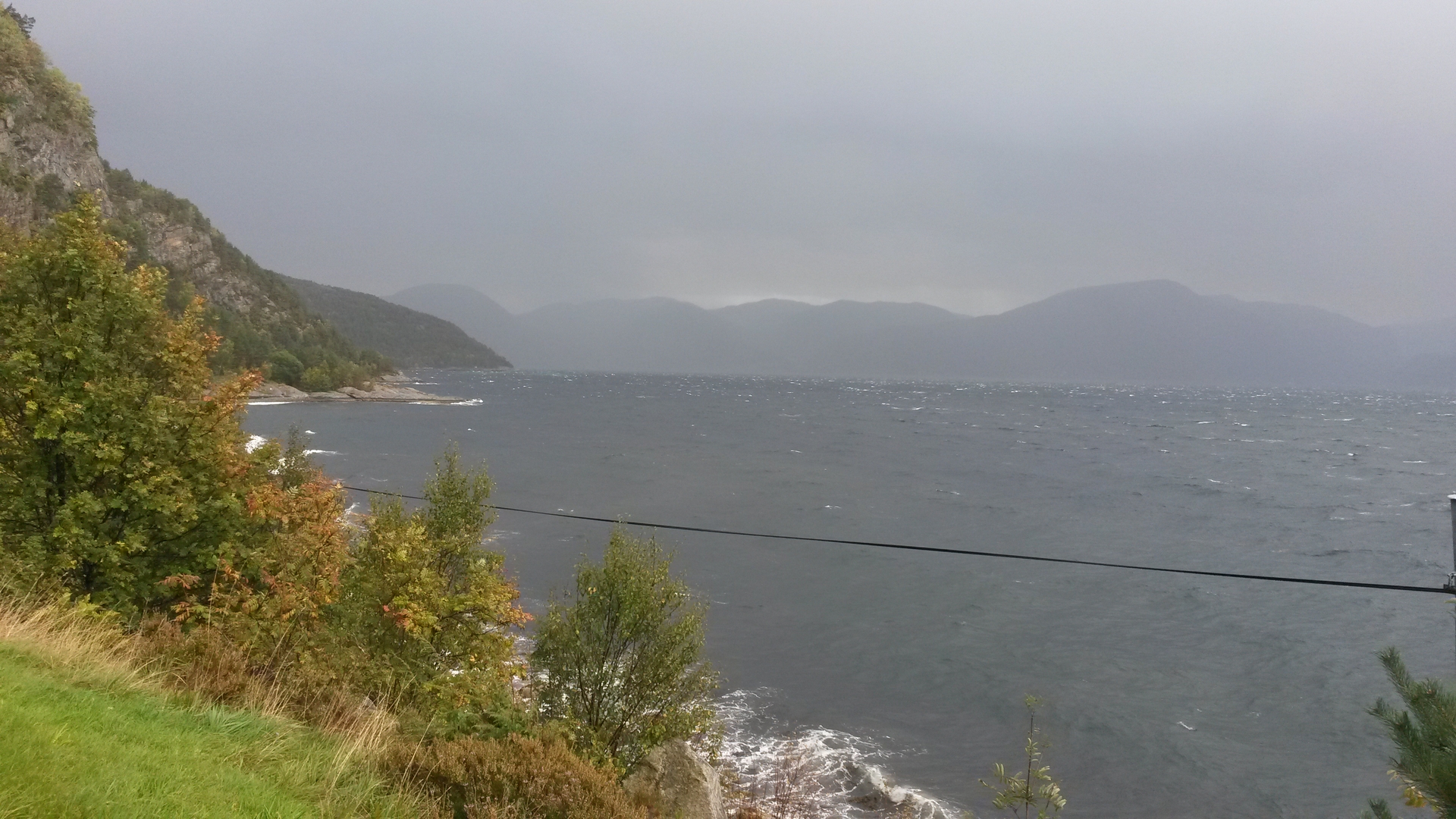 Nachts war es soweit windstill. Gegen Morgen wird's windig und das Wetter ist so hässlich, dass man die andere Fjordseite nicht sehen kann. Am Vormittag wir des mit einem Mal so heftig stürmisch und es beginnt zu regnen. Auf dem Fjord haust es. Wir sehen Wellen und große, weiße Schaumkämme. Wir nehmen die Blumen von der Hauswand, damit sie nicht runterfallen.